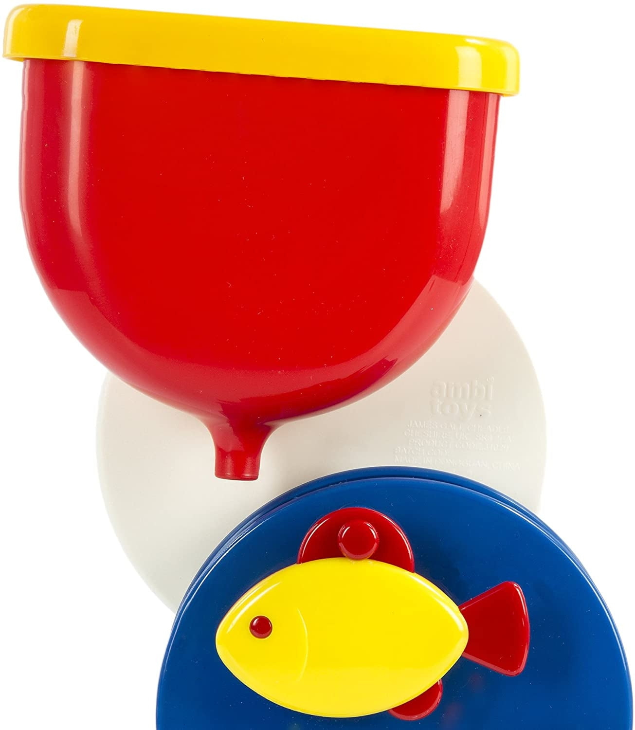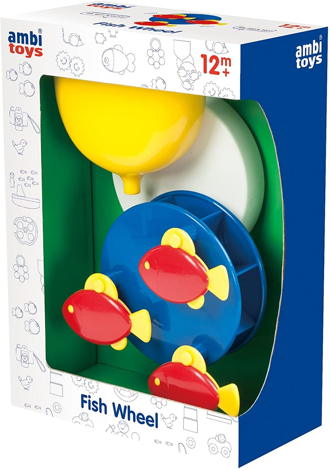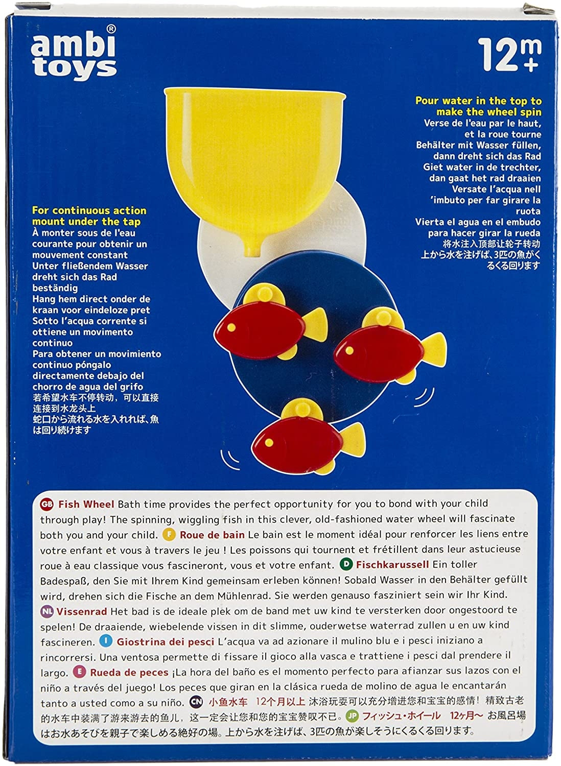 Galt Ambi Toys Fish Wheel is a bath toy with a spinning wheel of fishes and a funnel at the top. Pour in the water at the top, water will flow through the funnel and push the wheel, causing it to spin. Watch the pretty fish spin around merrily on the wheel! The funnel is also detachable to be played as a water scoop for more bath time fun for parent and child!