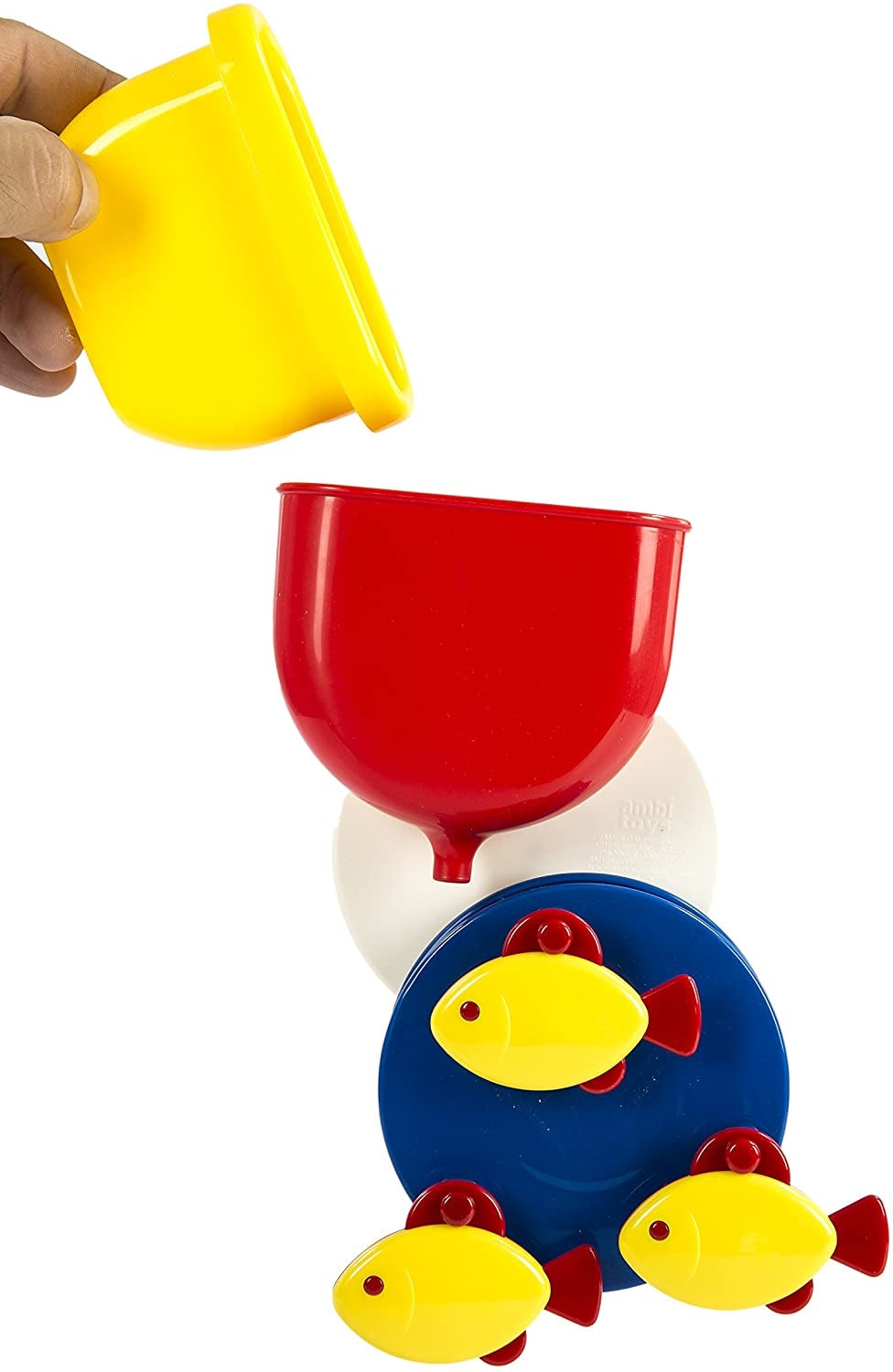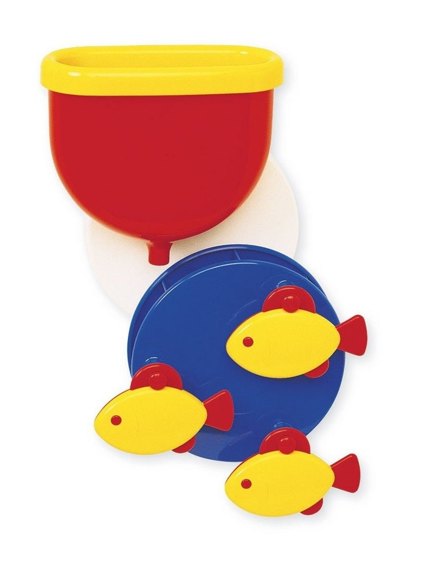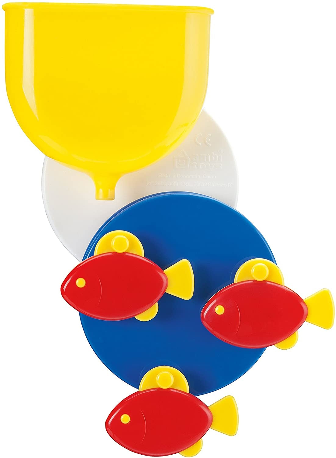 Galt Ambi Toys Fish Wheel is a bath toy with a spinning wheel of fishes and a funnel at the top. Pour in the water at the top, water will flow through the funnel and push the wheel, causing it to spin. Watch the pretty fish spin around merrily on the wheel! The funnel is also detachable to be played as a water scoop for more bath time fun for parent and child!