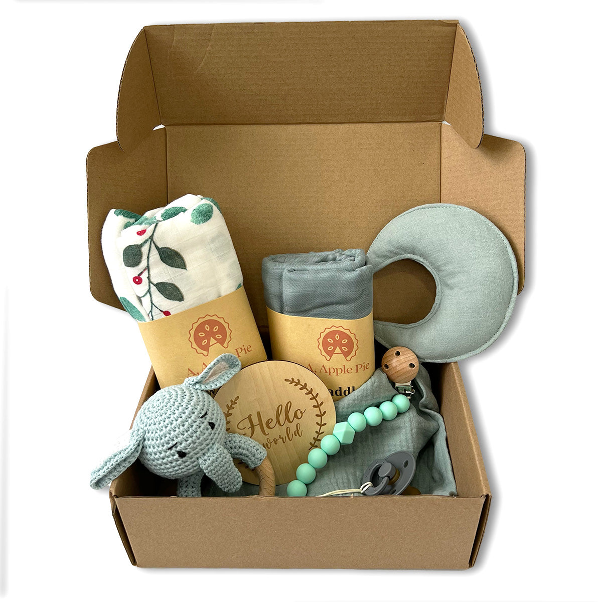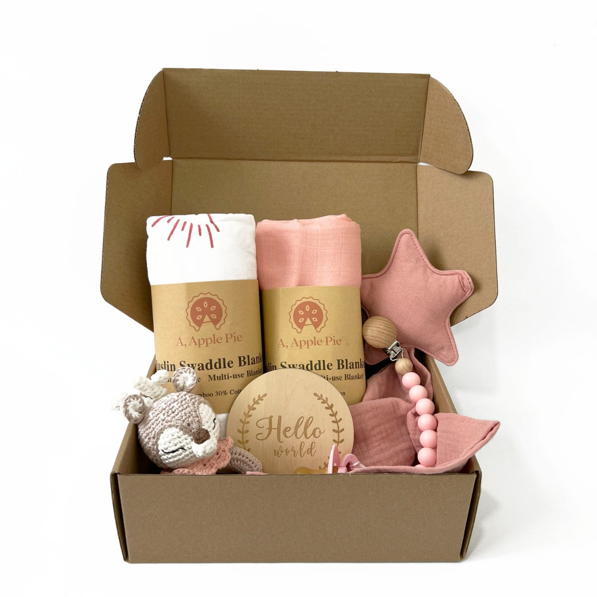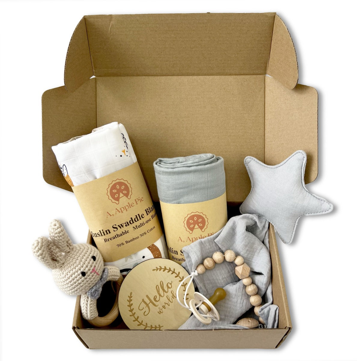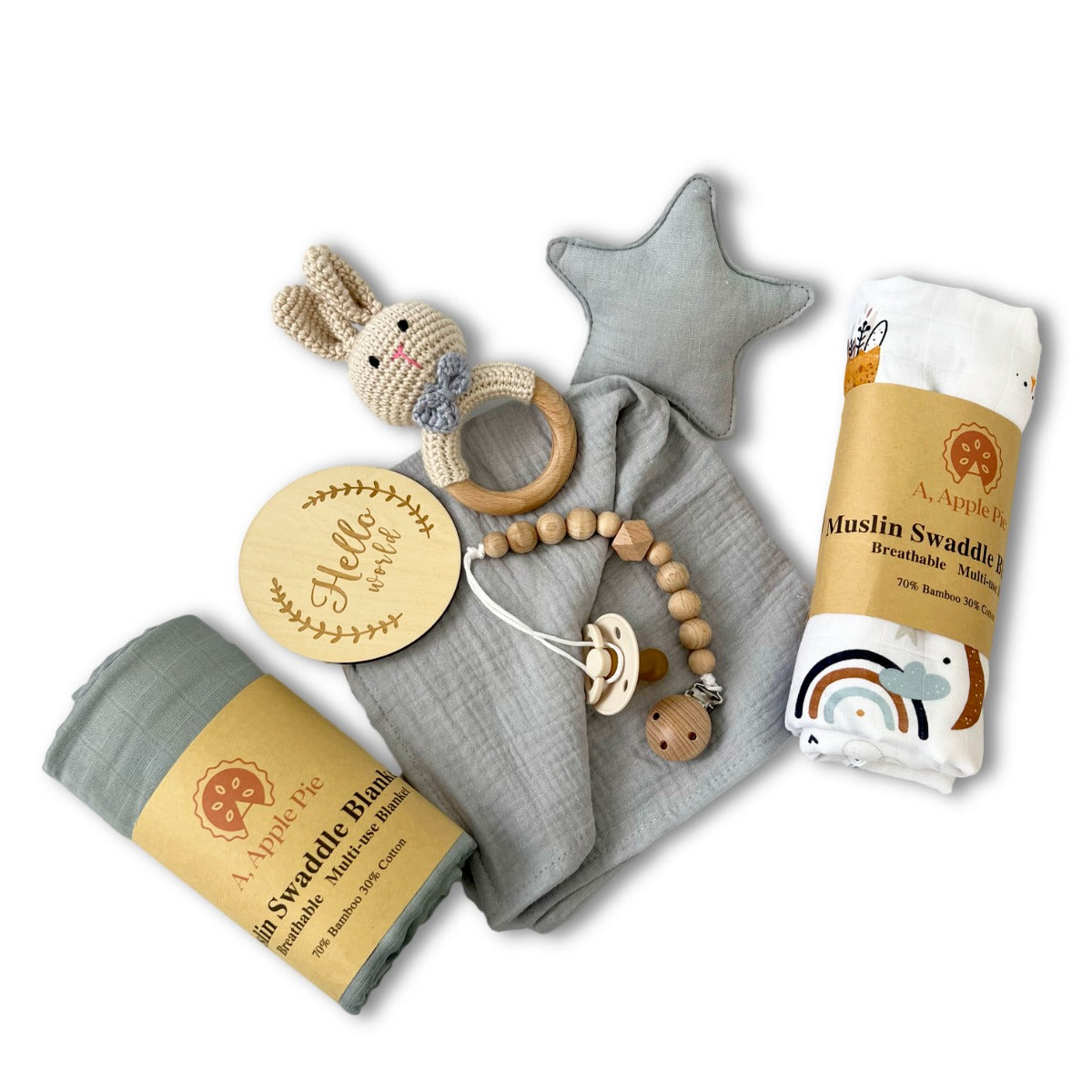 A, Apple Pie Baby Sweet Dreams Gift Set is a perfect baby shower gift set to welcome any newborn into this beautiful world. The sweet dreams gift set comes with 2 x Muslin Breathable Swaddles – printed and solid colour design (made of 70% bamboo and 30% cotton), 1 x soft lovey blanket, 1 x pacifier clip, 1 x silicone pacifier and 1 x milestone card. Made of the softest and non-toxic material that is safe and gentle enough for the little bundle of joy. All nicely packed into an eco-friendly kraft recyclable box! This box is filled with beautiful and practical essentials for newborns. A thoughtful and warm gift for baby showers, first birthdays, Christmas and more!