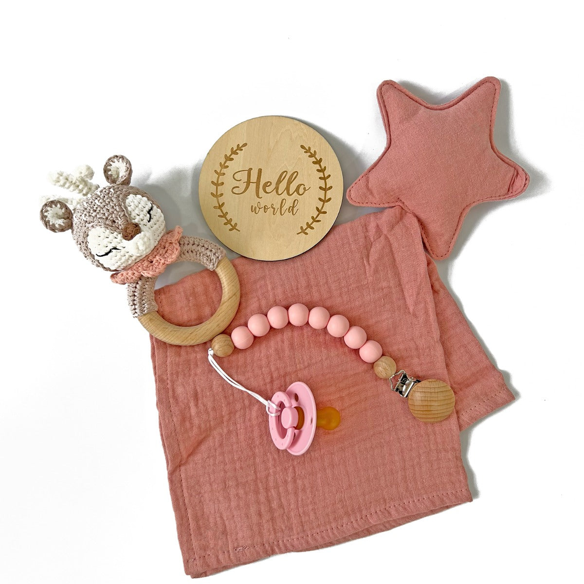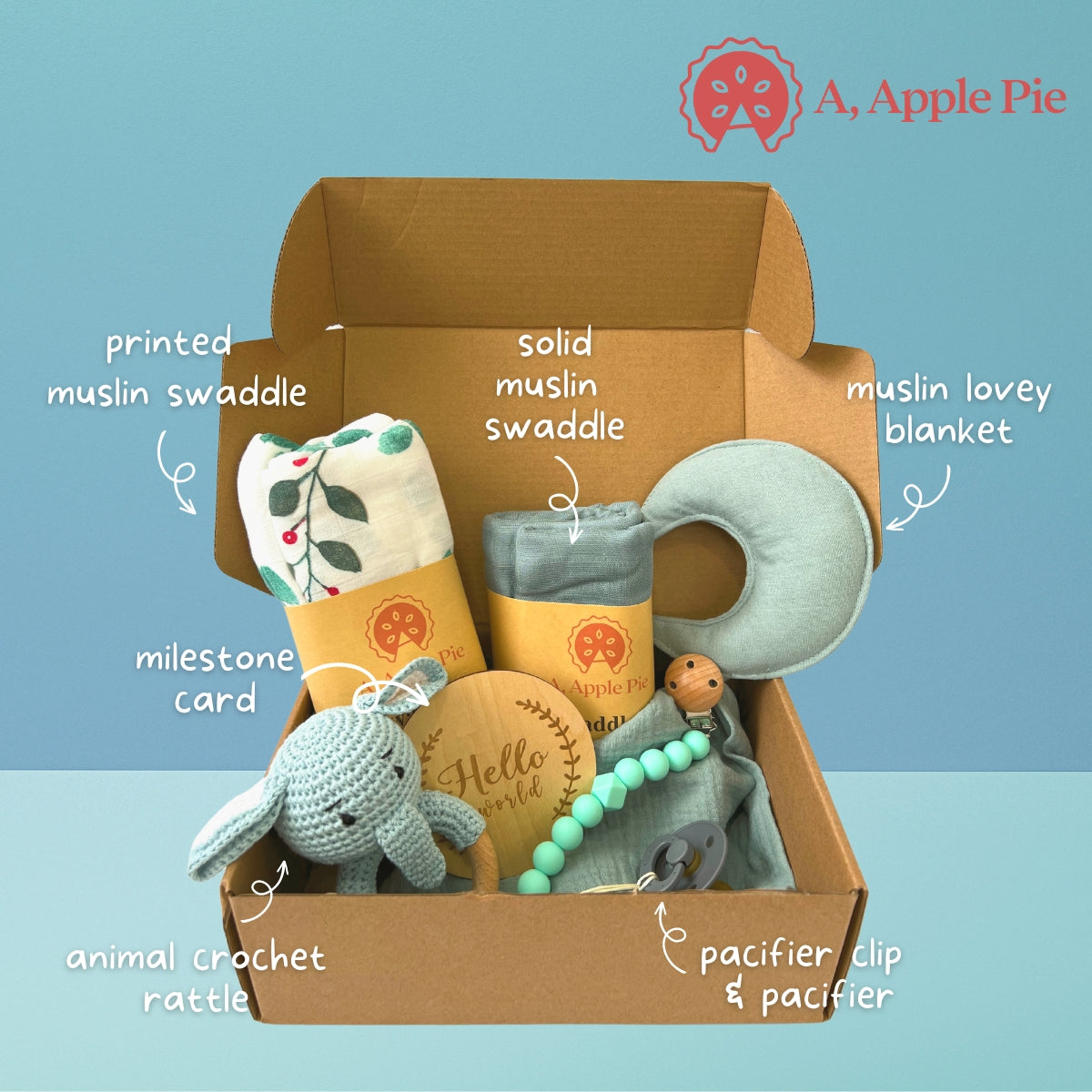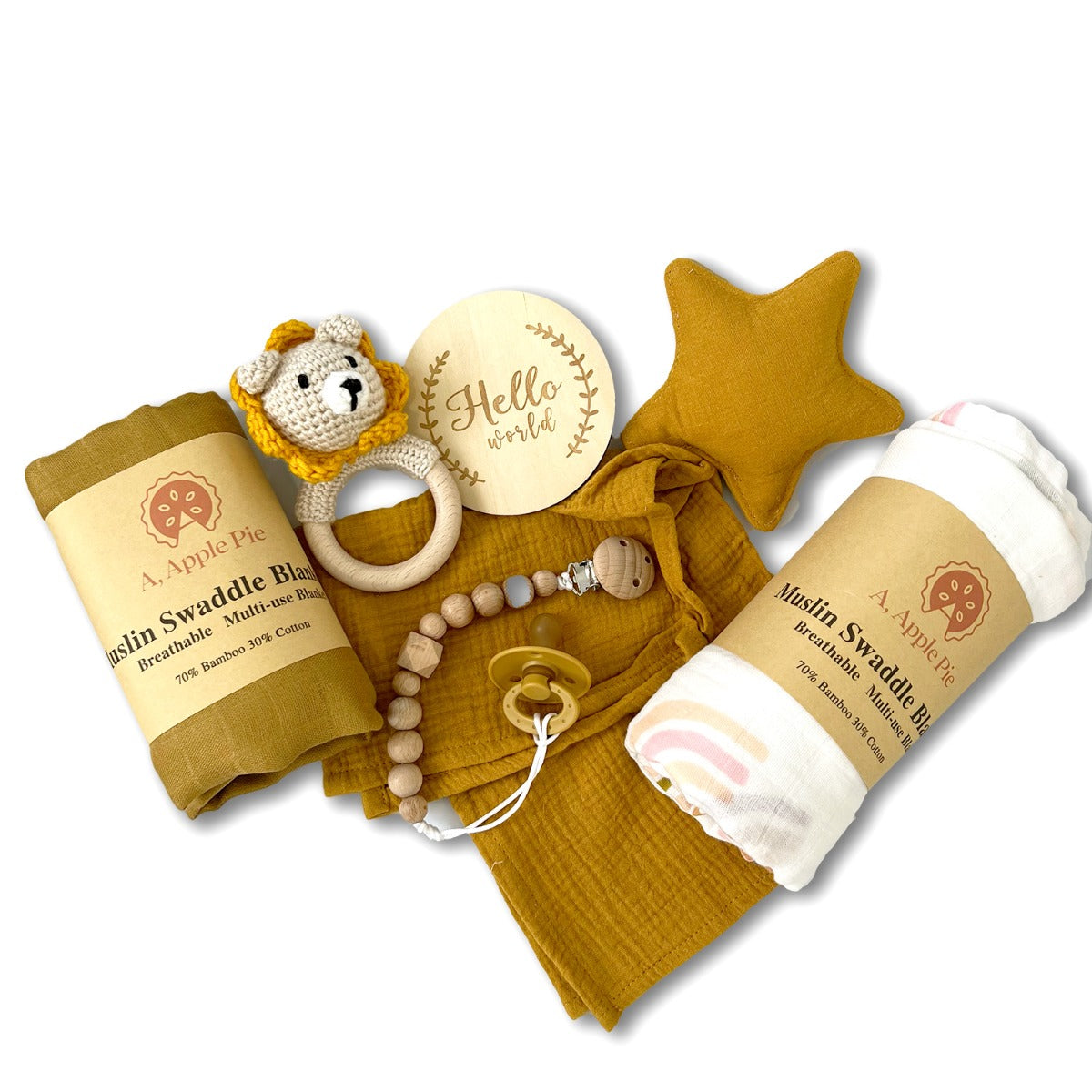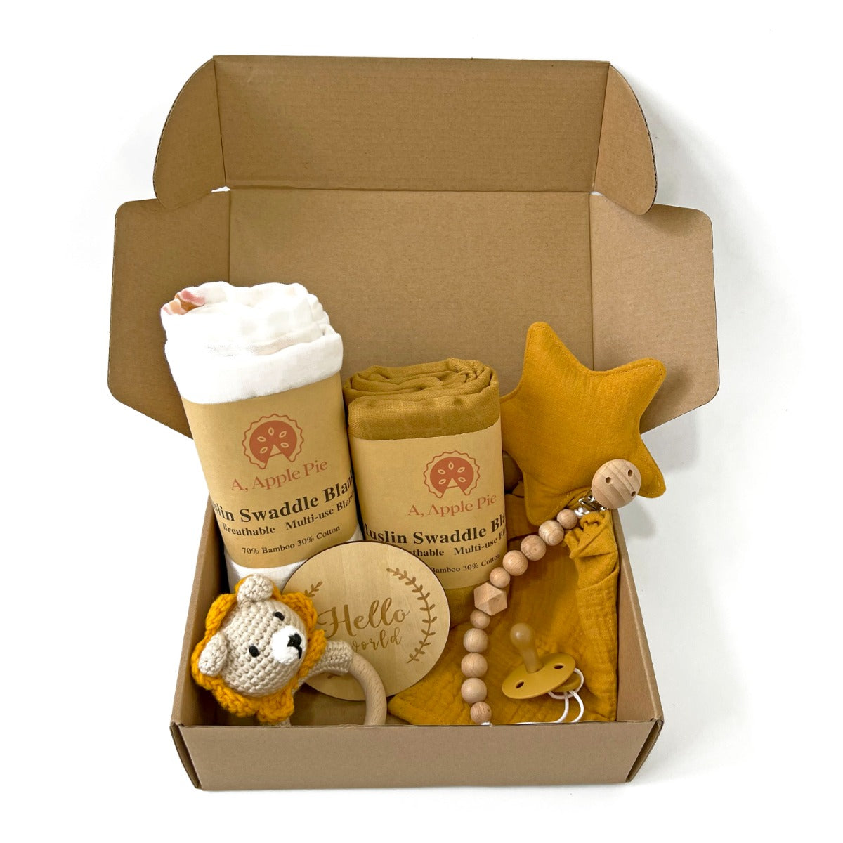 A, Apple Pie Baby Sweet Dreams Gift Set is a perfect baby shower gift set to welcome any newborn into this beautiful world. The sweet dreams gift set comes with 2 x Muslin Breathable Swaddles – printed and solid colour design (made of 70% bamboo and 30% cotton), 1 x soft lovey blanket, 1 x pacifier clip, 1 x silicone pacifier and 1 x milestone card. Made of the softest and non-toxic material that is safe and gentle enough for the little bundle of joy. All nicely packed into an eco-friendly kraft recyclable box! This box is filled with beautiful and practical essentials for newborns. A thoughtful and warm gift for baby showers, first birthdays, Christmas and more!