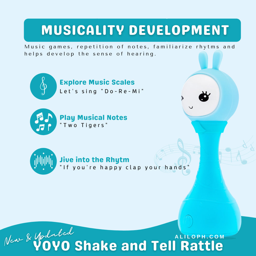 I’m the new and updated Yoyo Bunny! This interactive rattle can help your little one learn the alphabet (A-Z), count numbers (0-100), basic of musics (Do-Re-Mi, Rhytms, Notes, Scales), and play games too by shaking it (game included)! On top of this, it also has preloaded nursery rhymes (16 songs), sleeping music (5 lullabies), bedtime stories (5 stories) and sound recognition (40 sounds).