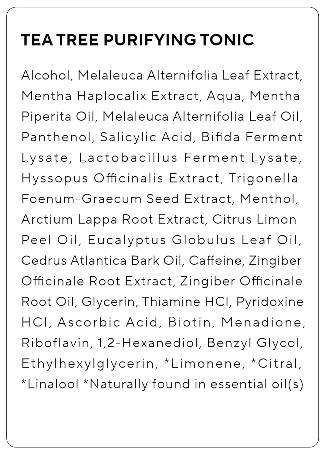 Tea Tree Essential Oil, Tea Tree Decoction Extract, BHA (Salicylic Acid), Peppermint, Eucalyptus