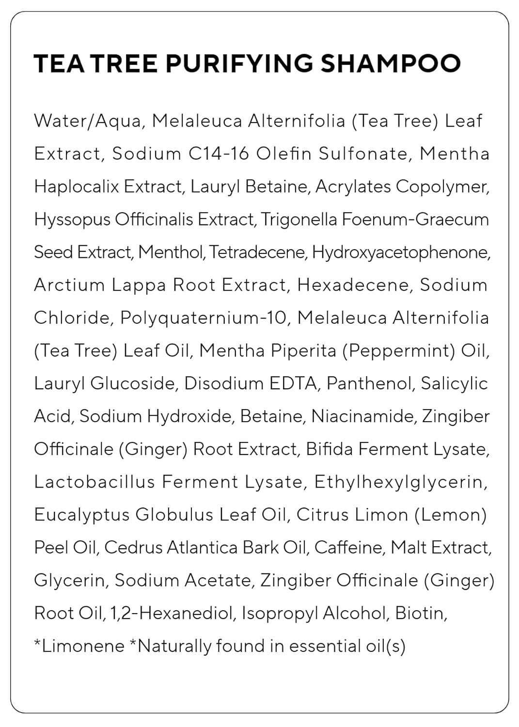 Oily scalp may lead to hair loss when pores remain clogged up from excess sebum production. TEA TREE PURIFYING SHAMPOO formulated with tea tree that manages excess sebum production, while BHA (salicylic acid) gently exfoliates away dead skin cells for a clean and refreshed scalp.