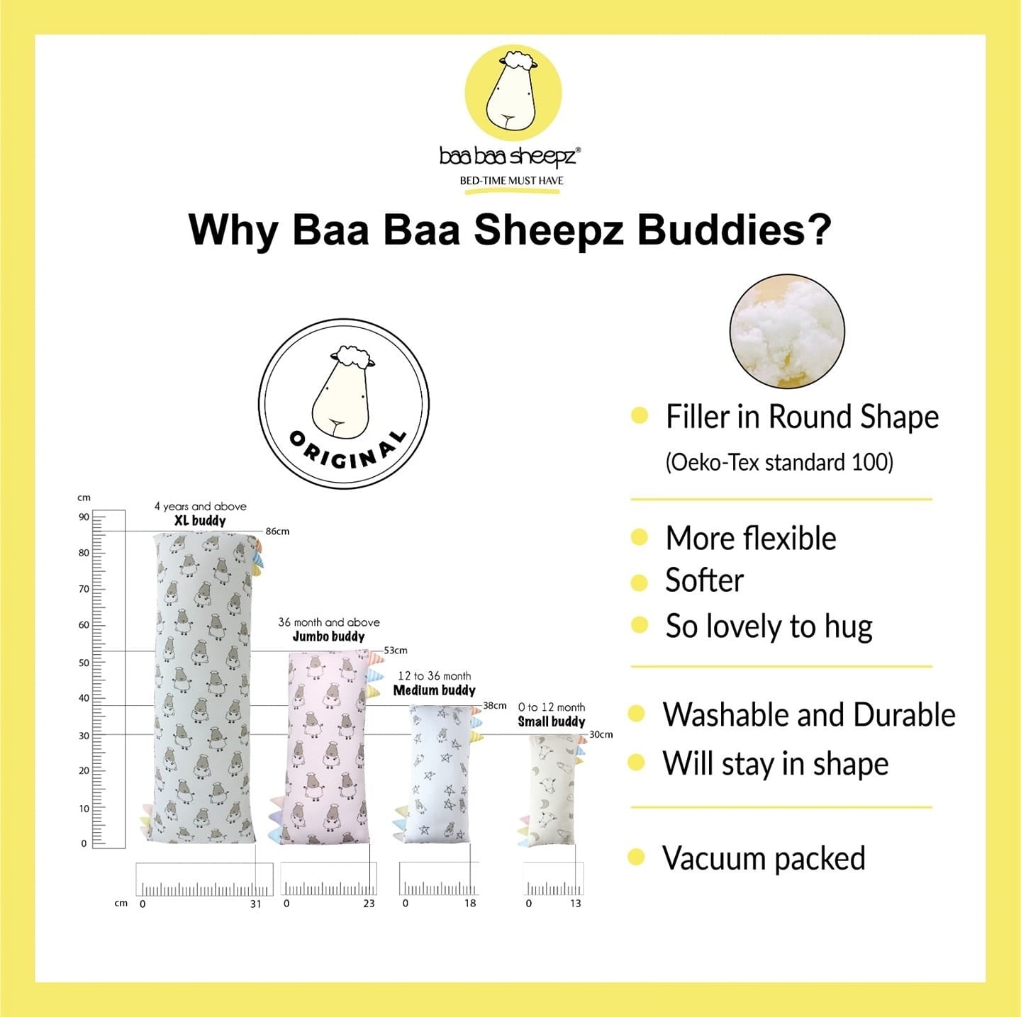 Baa Baa Sheepz Bed-Time Buddy XL Pillow is a jumbo sized long pillow with fabric tags at the sides for baby to pull and bite on. This pillow is great as a sleep soother, baby's bed-time buddy, and even a sleep positioner. A chow chow, best companion for baby toddlers kids and adults!