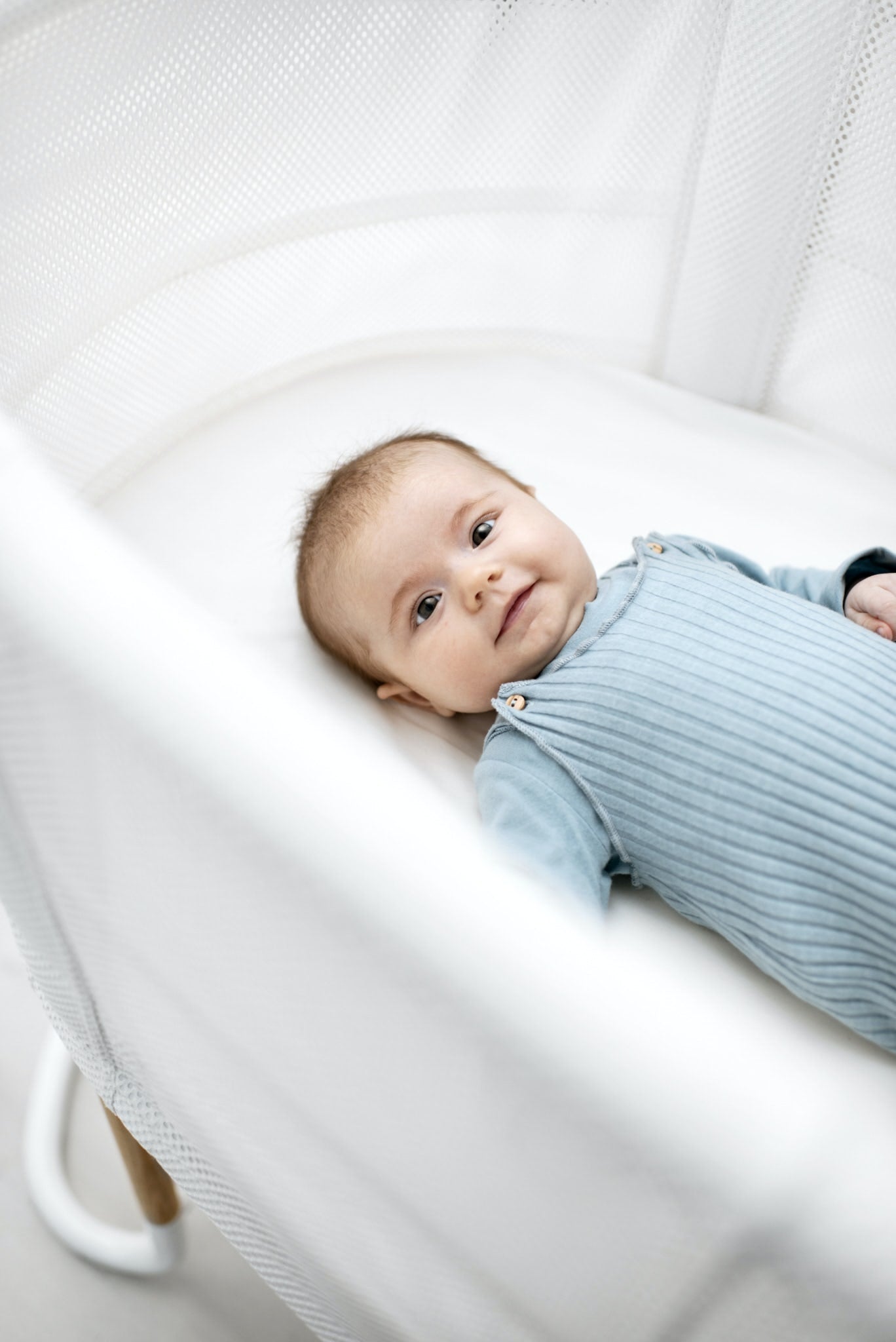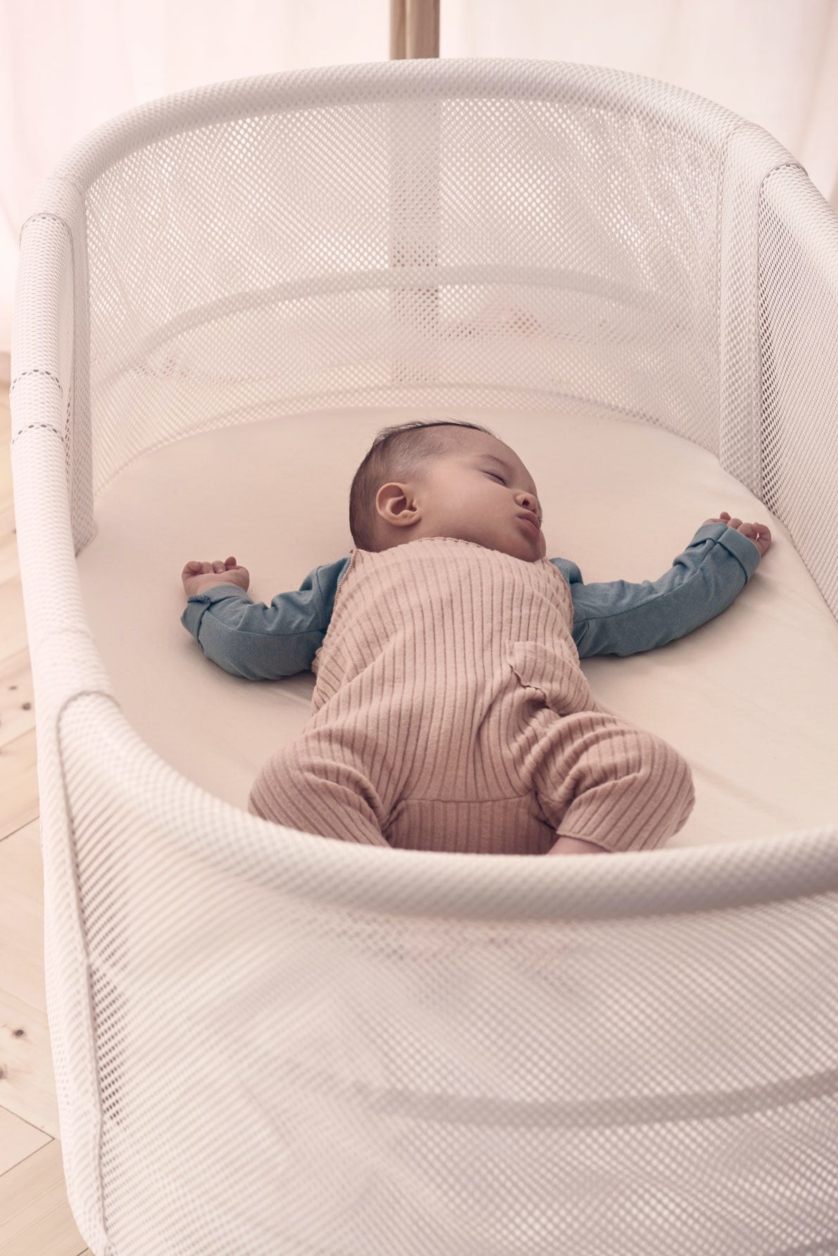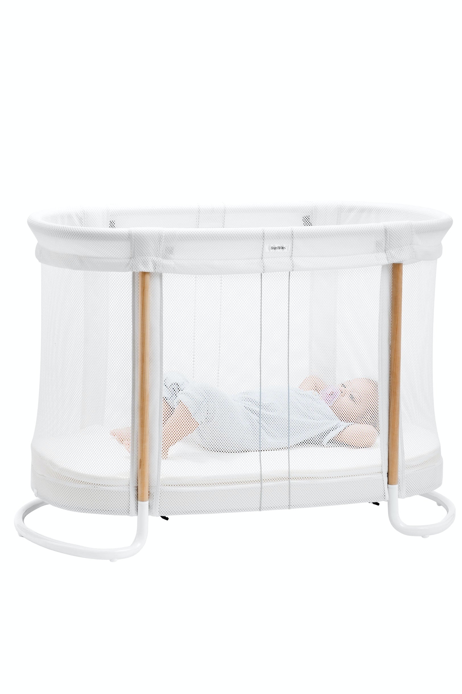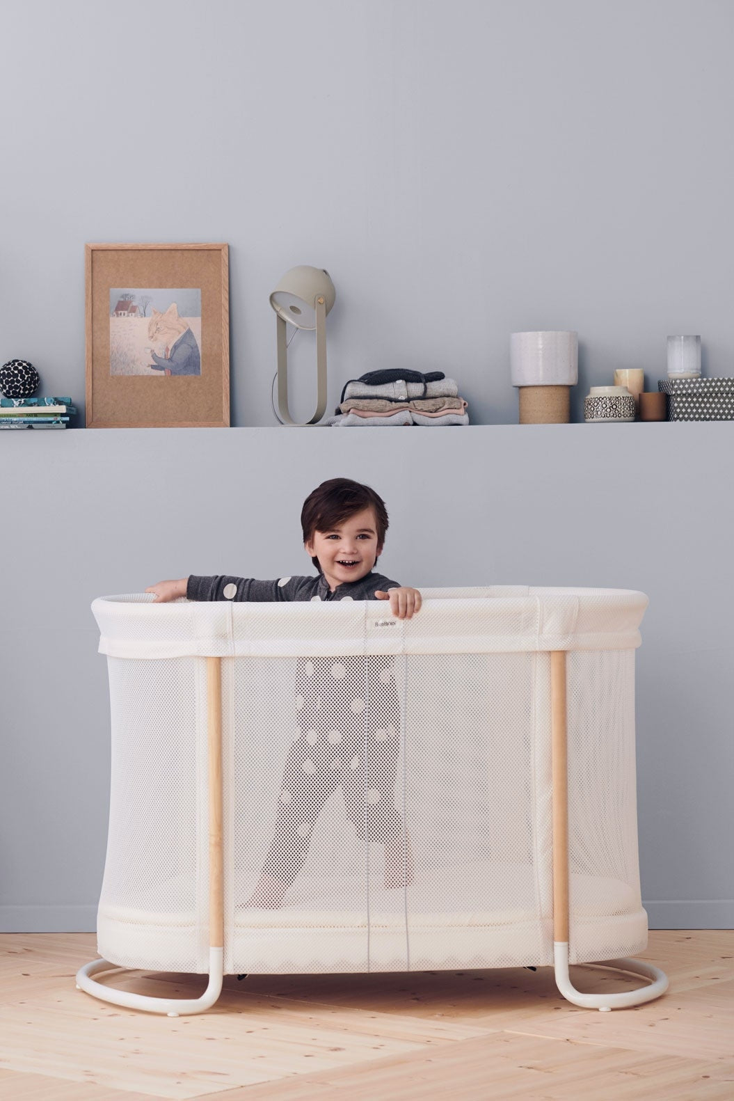 The baby crib has been developed in consultation with safety experts, and the airy sides are a soft mesh. The specially tailored mattress has been integrated into the side mesh, creating a unique solution that provides good ventilation and means you never have to worry about your baby’s arms or legs getting stuck.