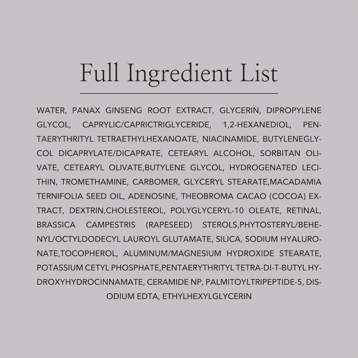 Water, panax ginseng root extract, glycerin, dipropylene glycol, caprylic/caprictriglyceride, 1,2-hexanediol, pentaerythrityl tetraethylhexanoate, niacinamide, butyleneglycol dicaprylate/dicaprate, cetearyl alcohol, sorbitan olivate, cetearyl olivate,butylene glycol, hydrogenated lecithin, tromethamine, carbomer, glyceryl stearate,macadamia ternifolia seed oil, adenosine, theobroma cacao (cocoa) extract, dextrin,cholesterol, polyglyceryl-10 oleate, retinal, brassica campestris (rapeseed) sterols,phytosteryl/behenyl/octyldodecyl lauroyl glutamate, silica, sodium hyaluronate,tocopherol, aluminum/magnesium hydroxide stearate, potassium cetyl phosphate,pentaerythrityl tetra-di-t-butyl hydroxyhydrocinnamate, ceramide np, palmitoyltripeptide-5, disodium edta, ethylhexylglycerin *Non-binding information
