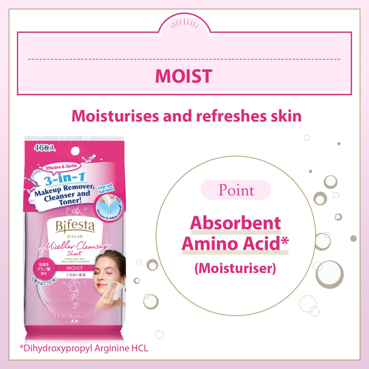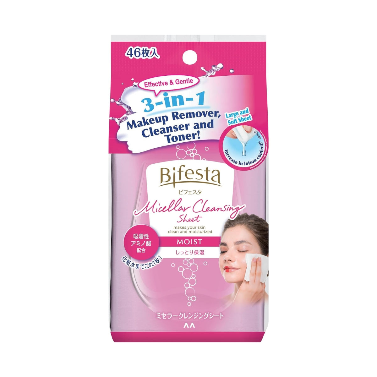 [New Version] Bifesta Micellar Cleansing Sheets - Makeup Remover Wipes, 46pcs - Moist (Exp 11/27)