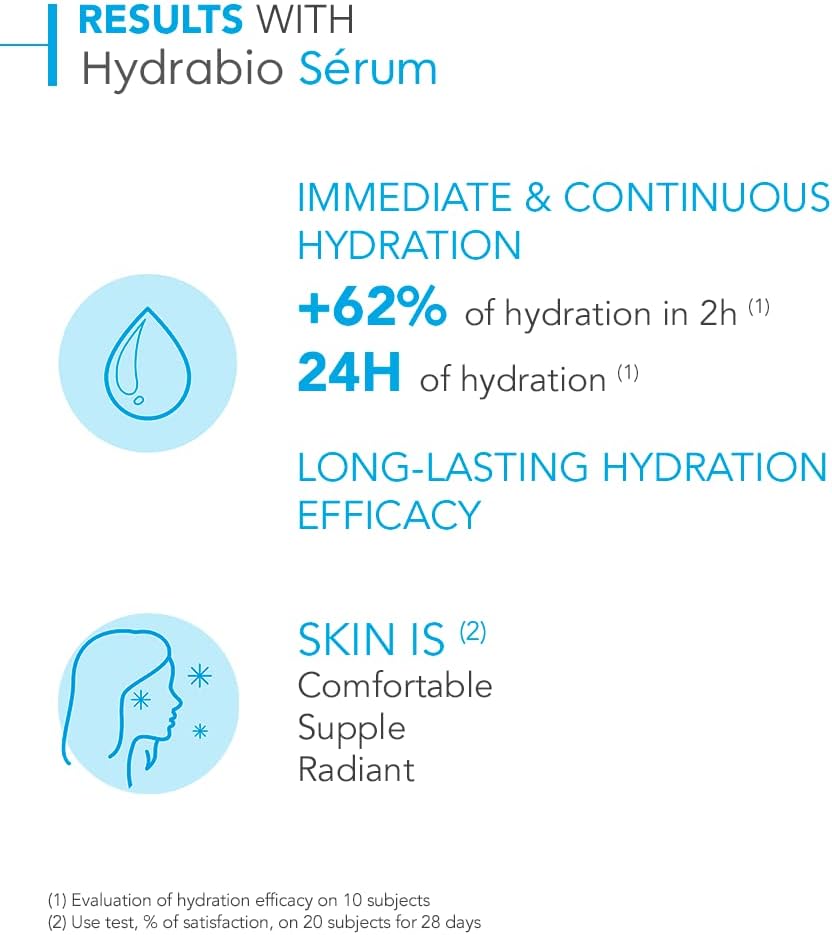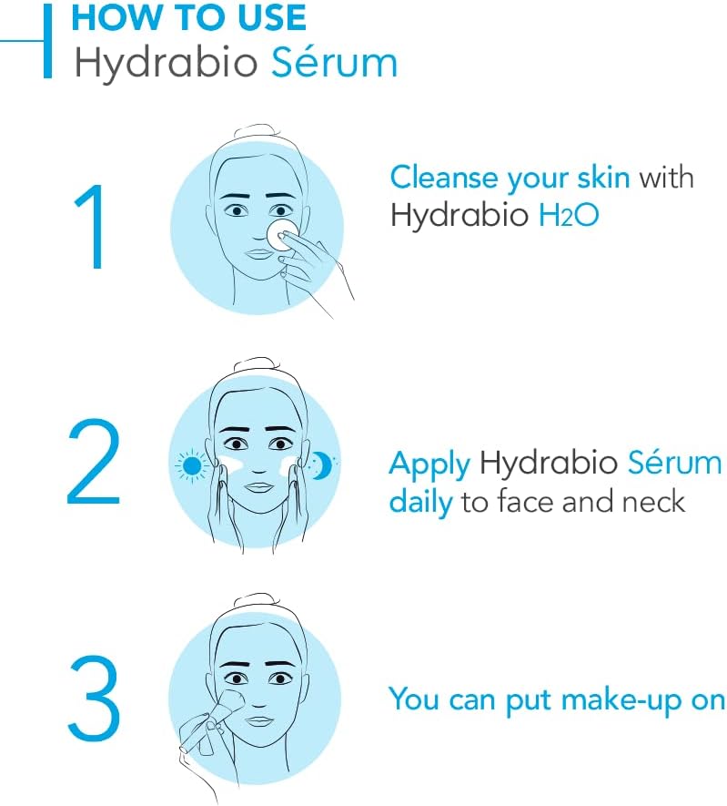 • Apply Hydrabio Sérum in the morning and/or evening on your face and neck, after cleansing and toning.