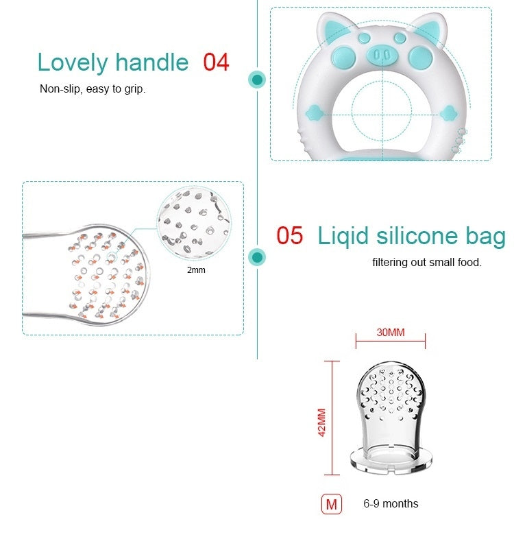 - Soft silicone pouch with small holes for easy feeding that only allow small, digestible pieces to pass through.
