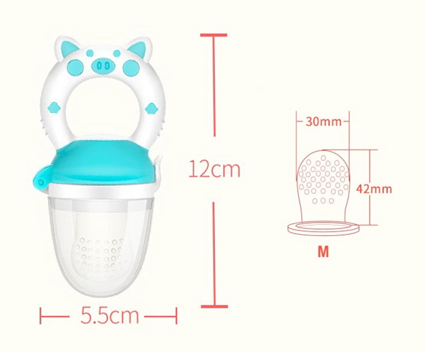 Biomom Food Feeder & Teether is a 100% food grade silicone fresh fruit & baby food feeder which provides a safe way to introduce our little ones to solid food while they go through weaning and teething phase. Simply place fruit, vegetables or meat into the silicone teat, there are holes in the teat that will let your child enjoy the flavour and texture of the food. This feeder can also soothe baby's teething discomfort by massaging the gums through chewing. The perfect way to introduce solids into your babies diet without the risk of choking!