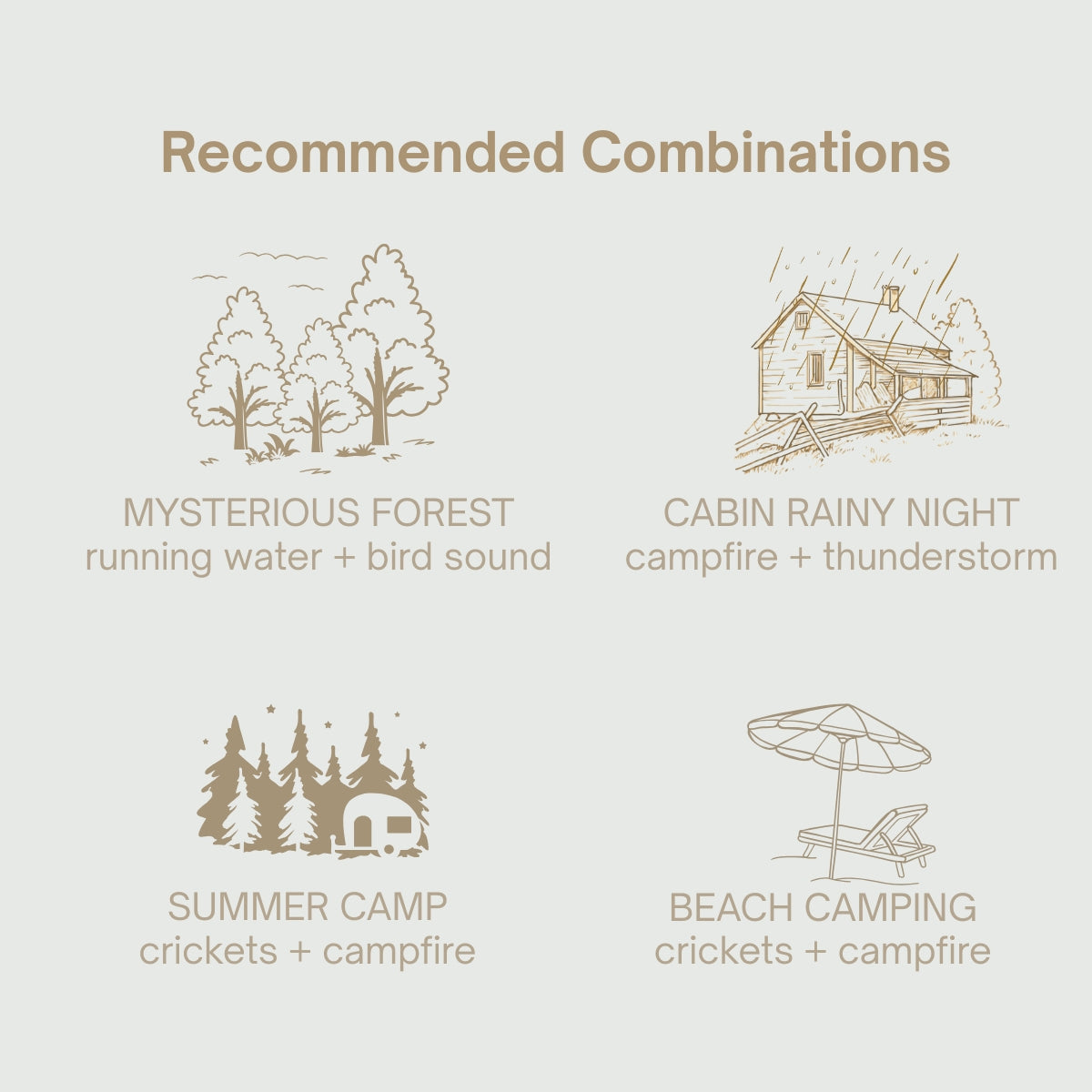 This white noise machine allows you to freely combine multiple natural sounds to create your ideal listening experience. It features 8 classic nature sounds: sea waves, alpha waves, running water, thunderstorm, campfire, birdsong, crickets, and white noise. With up to 255 soothing sound combinations, you can mix and match according to your mood or environment for personalized relaxation.