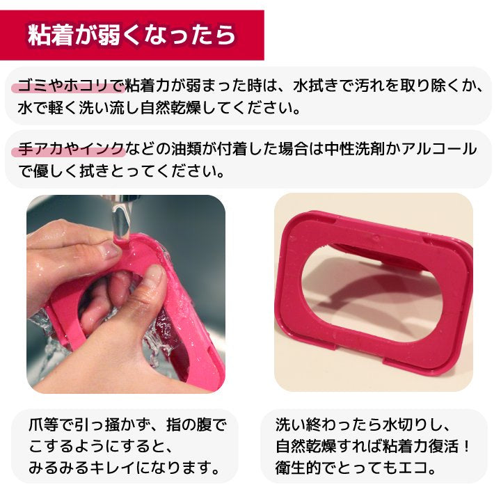 Bitatto Plus One-Push Wet Wipes Lid is a a convenient, economical, and easy-to-use lid for wet wipes. The long-awaited one-push type is now available from the hugely popular "Bitatto" peel-and-stick wet wipes lid! It pops open with just a single push of your finger, making it perfect for changing baby diapers and for nursing care! It can accommodate a wide variety of wet wipes, but this time we made the opening larger so that it can also be used to wipe adults' bodies. The top cover has a glossy finish that makes it easy to remove dirt, and the outer frame with the push surface has a matte finish that prevents your fingertips from slipping, making it easy to use. Furthermore, this top cover can be removed, so you can even replace it with a frame of a different color.