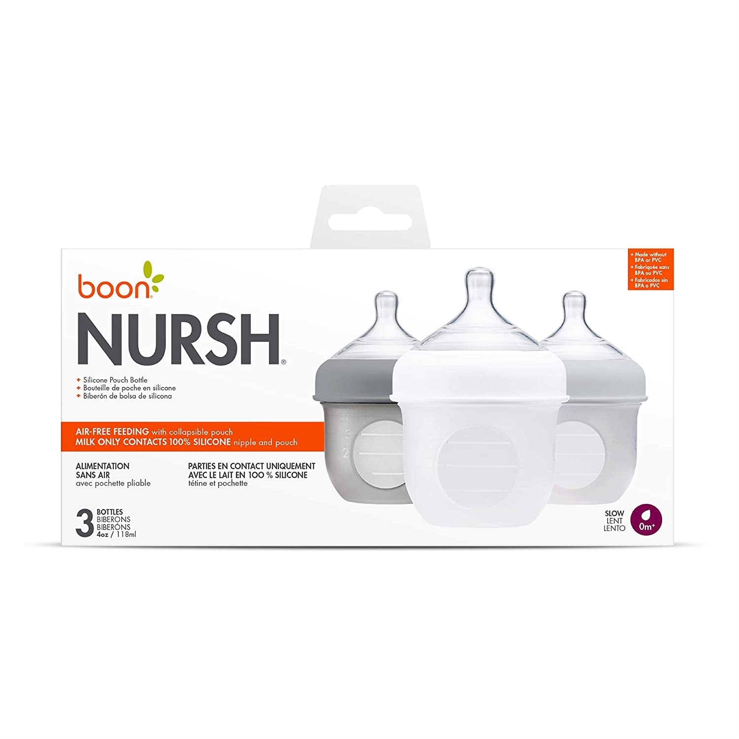 INNOVATION. SUCK ON THAT. It’s the best thing to happen to feeding since nipples. Boon NURSH silicone bottle has reusable pouches that collapse as baby drinks, cutting down on the ingestion of air and decreasing the likelihood of painful gas, reflux, colic and burps. Boon NURSH nipple is the right length for optimal tongue positioning and features a gradual transition from nipple to wideneck base for perfect latching. Our baby bottles are made without PVC or BPA and are lightweight (5 ounces).