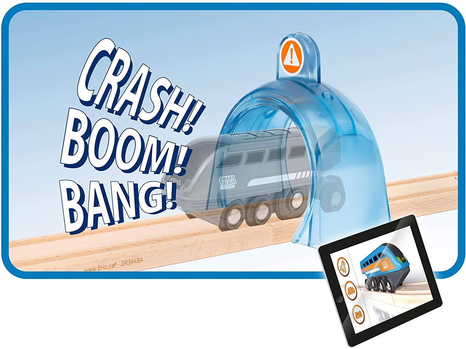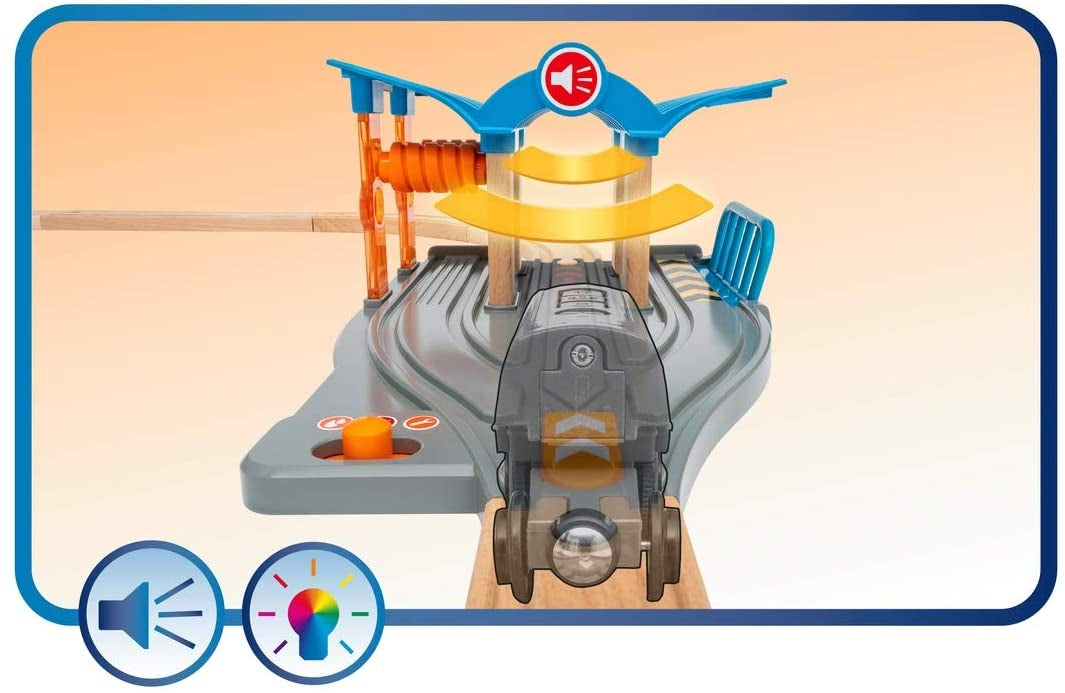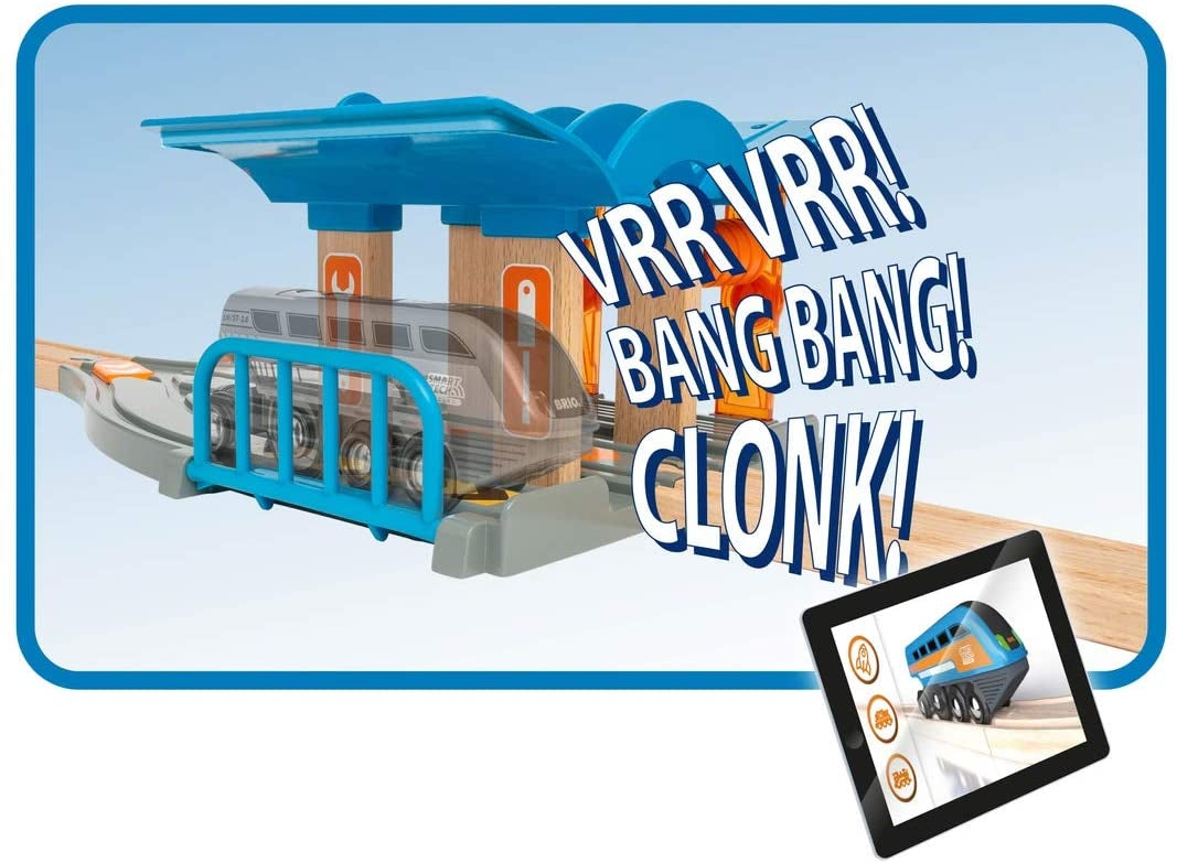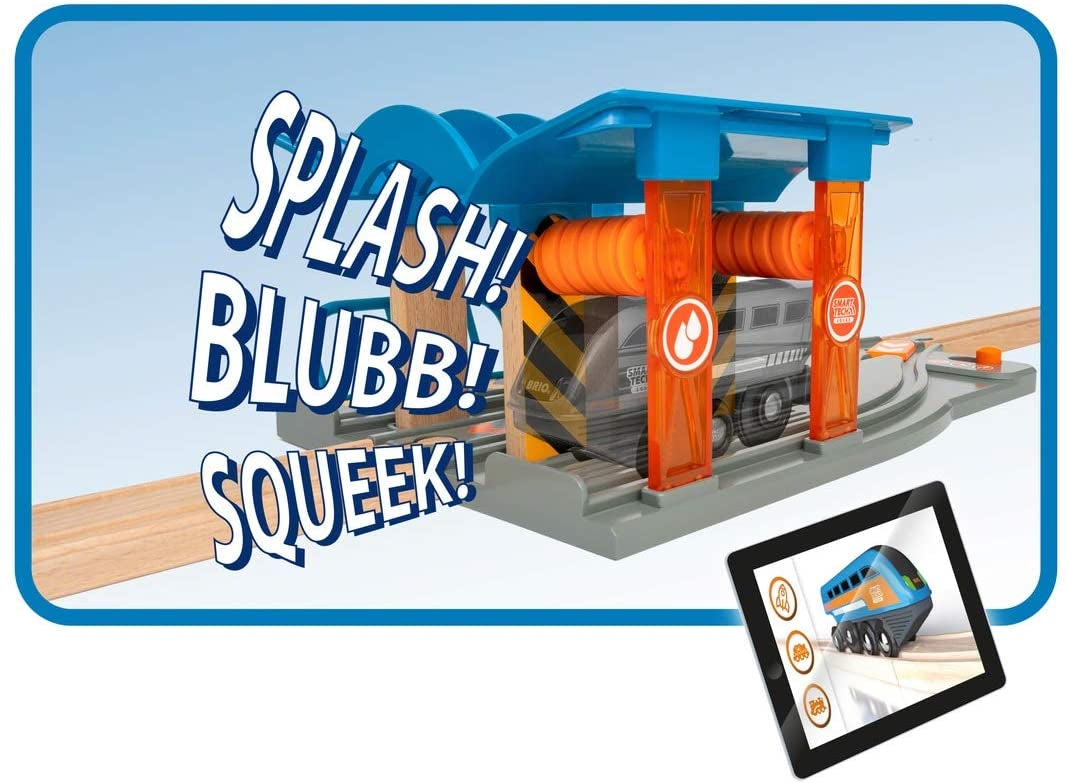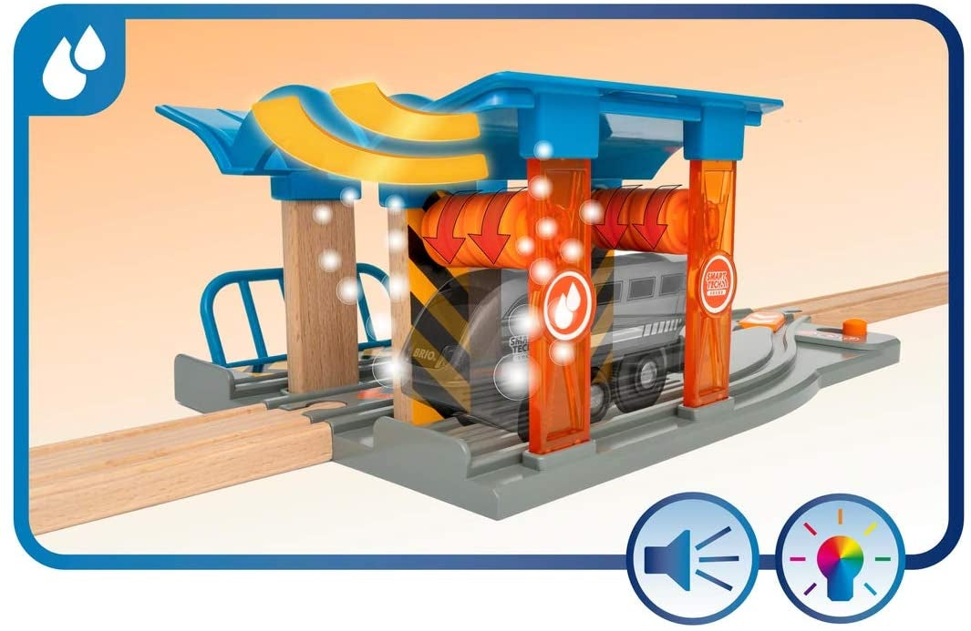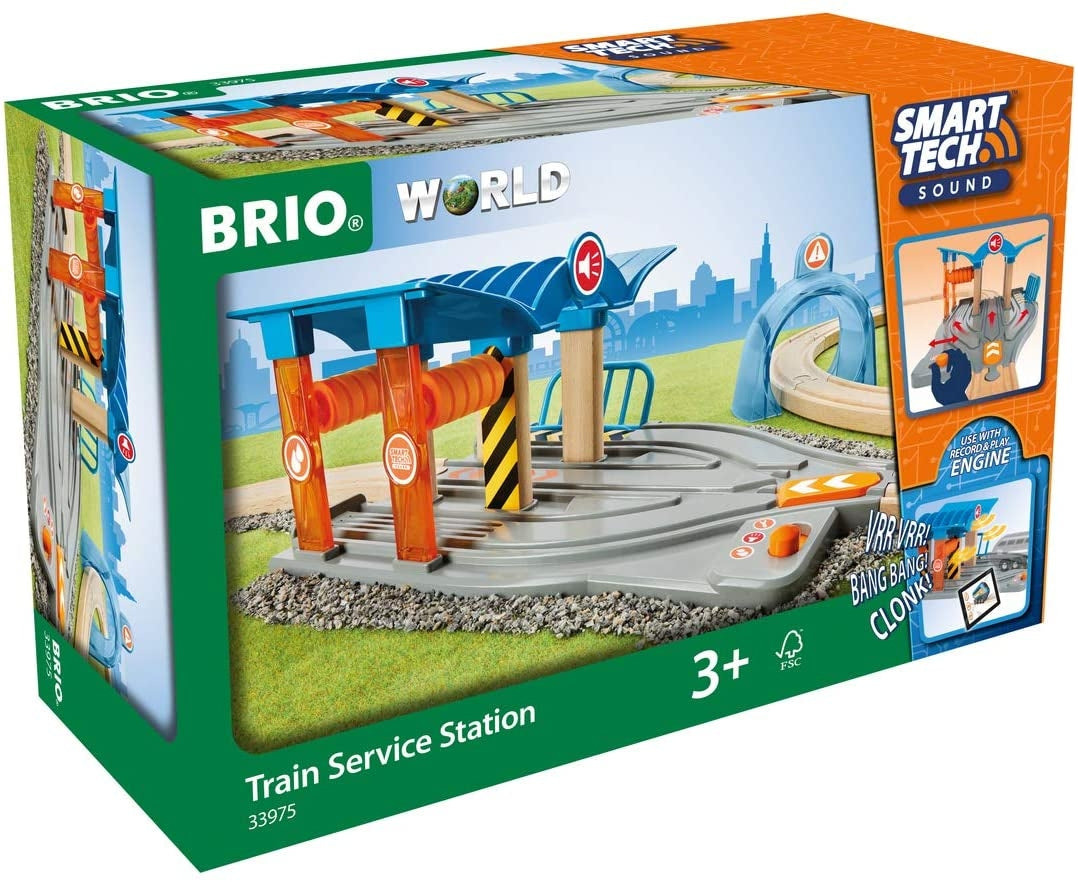 Brio Smart Tech Sound Train Service Station is an interactive and realistic toy train service station that provides a pit stop for trains to get repaired and scrubbed. This train service station offers full-service to all BRIO World trains passing through! Use the Train Service Station with the 33971 Record & Play Engine (not included) to add even more action to your railway play through Smart Tech Sound features. Send the engine to the left for a clean-up in the washing station or if the engine is “broken” from the Break Action Tunnel, send it to the right for a fix-up in the repair station. The train will automatically come to life with realistic train sounds and animations. If no work is needed at all, it can pass straight on through. Connect to the Smart Tech Sound app using a mobile device and you can customize the service station’s sound environment. Choose from a selection of pre-recorded sounds or record your own through the app and then hear them as you play.