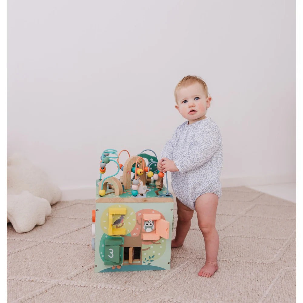 Bubble Wooden Activity Centre is a hub of excitement that effortlessly blends education with entertainment. Your baby will have endless entertainment with our five-sided cube that includes a twirly track, spinning cogs and gears, shape sorter and mirror. As a parent, you will take delight in watching your little one engage in these activities that develop hand-eye coordination and fine motor skills.