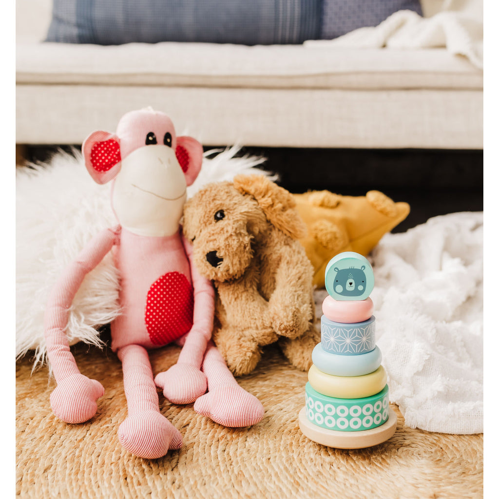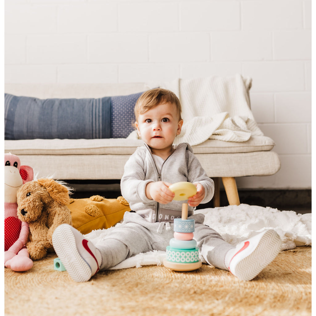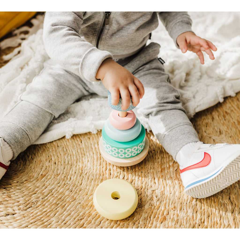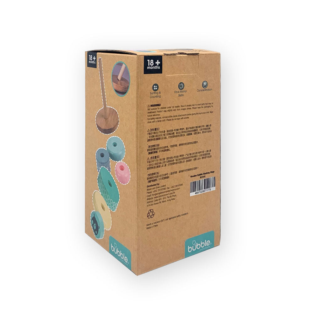 Bubble Wooden Stacking Rings is a beautiful and modern take on a traditional early learning toy, and definitely a must-have for every nursery or playroom! Older toddlers will enjoy stacking the rings, while younger babies will be engaged by the bright colours and chunky wood shapes. Our stacking set has five brightly coloured rings topped with a cute little bear. An additional feature is the wobbly base, which adds a slightly challenging and fun element for your little one stacking on the pole! This toys helps to develop hand-eye coordination and fine motor skills while learning about colors the basics of counting!
