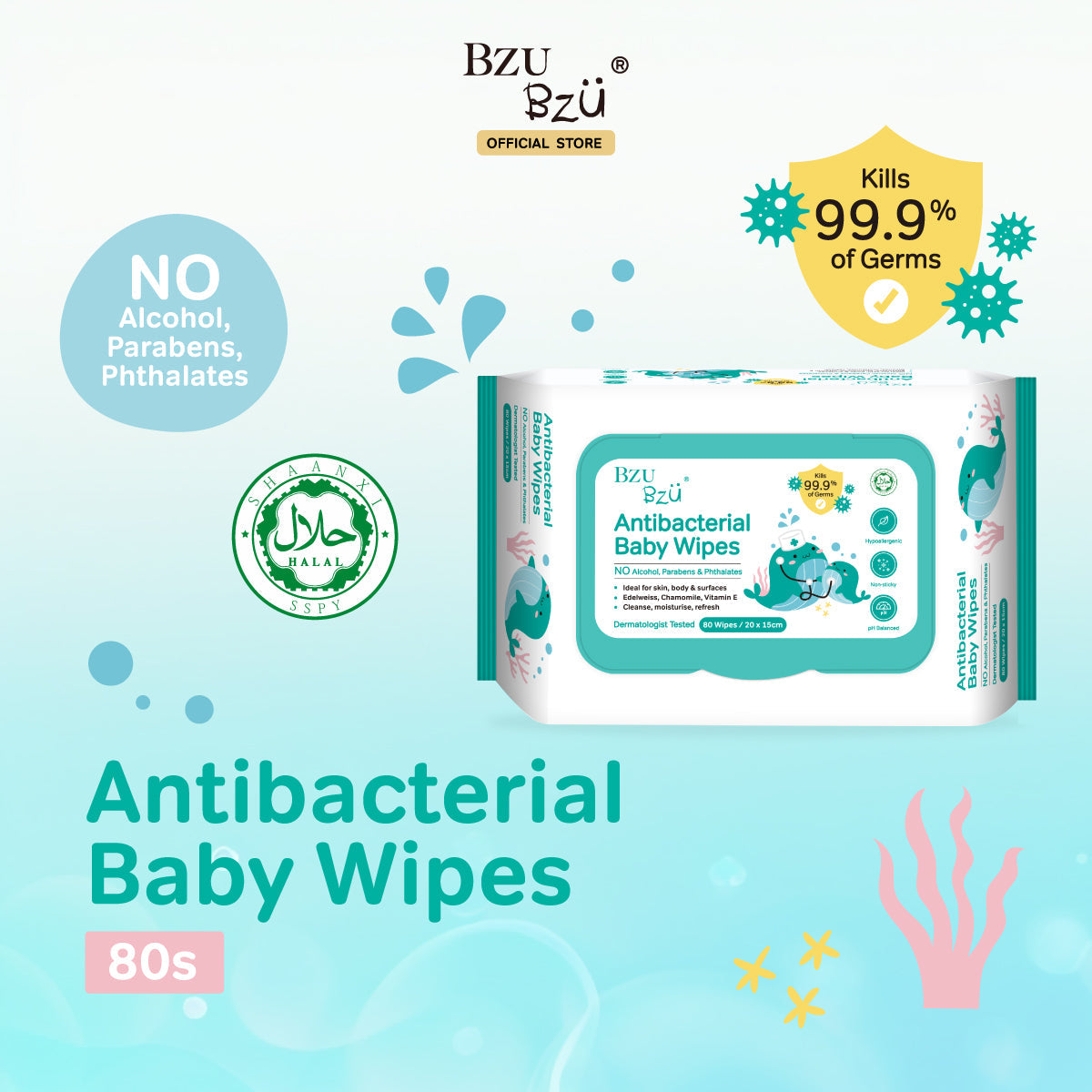 Bzu Bzu Antibacterial Baby Wipes are formulated with premium ingredients chamomile and edelwiss extract, with added Vitamin B & E that is gentle on skin. It cleanses gently while providing moisture for softer, more tender skin. These wipes are alcohol-free, asbestos-free and paraben-free.
