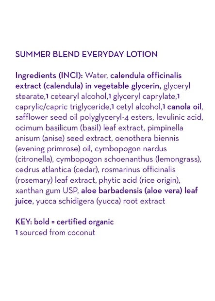 California Baby Everyday Lotion -Β Summer BlendΒ is a lotion withΒ fresh, vibrant essential oils of Citronella and Lemongrass, the great smell of summertime!Β ThisΒ super-soothing, vegan lotion is made with 100% plant-based ingredientsΒ that are not only better for sensitive skin and allergies but also better for our planet. A great choice for the whole family!