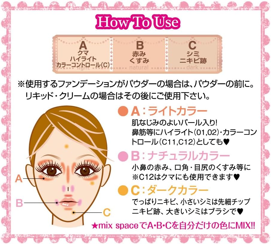 Canmake Color Mixing Concealer is a handy three-shade concealer palette that allows you to create a shade tailor-made for you. It is all you need to hide every kind of imperfection!Β Features a mixing space where you can mix the three colors to make just the right shade