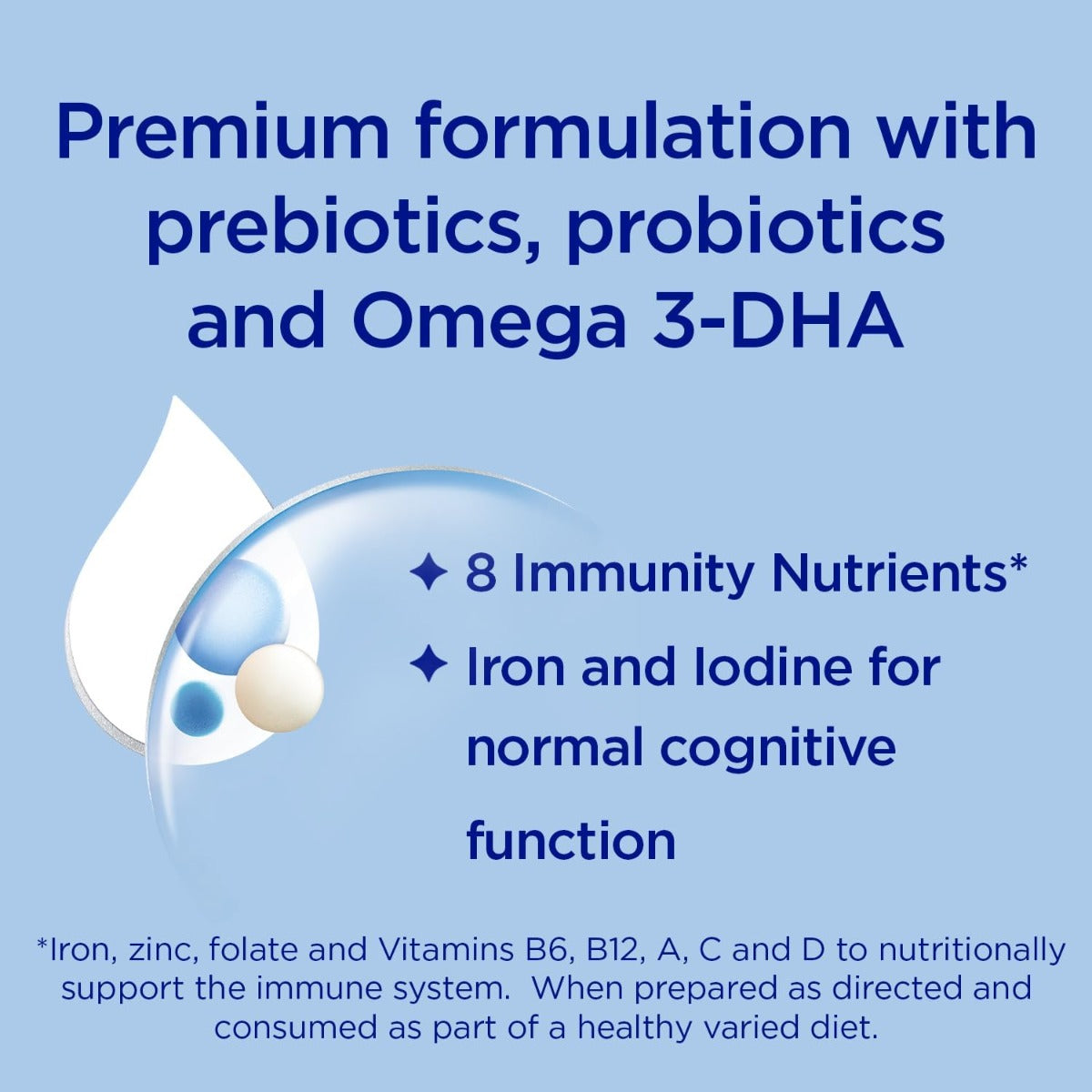 Milk solids, maltodextrin, vegetable oils (emulsifier (soy lecithin), antioxidant (ascorbyl palmitate)), short chain galacto-oligosaccharides (milk), dried omega LCPUFAs (fish oil contains milk, antioxidant (sodium ascorbate, mixed tocopherols, ascorbyl palmitate, dl-alpha tocopherol), whey protein (milk), emulsifier (soy lecithin)), long chain fructo-oligosaccharides, emulsifier (soy lecithin), Bifidobacterium breve M-16V.