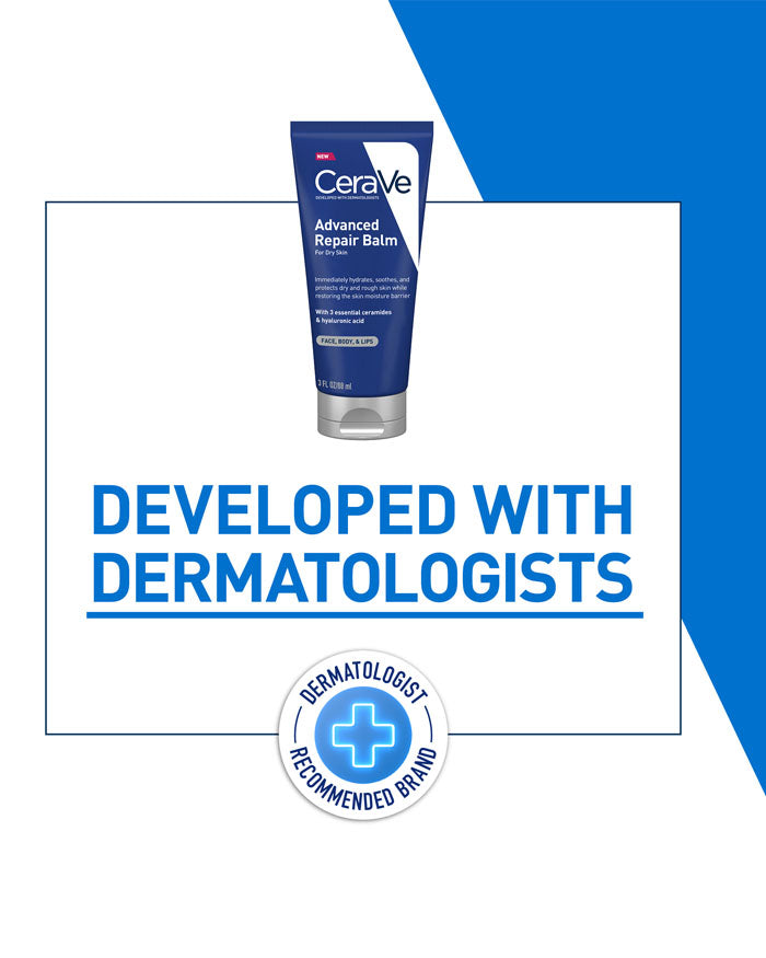 CeraVe Advanced Repair Balm is a multi-purpose repair balm that immediately hydrates, soothes, and protects dry and rough skin while restoring the skin moisture barrier. Combining 3 dermatologist-recommended occlusive ingredients, including petrolatum, with 3 essential ceramides and hyaluronic acid. Restores the skin moisture barrier with immediate soothing and lasting protection. CeraVe Advanced Repair Balm is non-greasy and creates a protective layer over the surface of the skin that can help shield mildly compromised skin from harsh environmental aggressors and bolster the skin's own natural moisture barrier capabilities for up to eight hours*. Non-comedogenic and compatible with all skin types, including those with sensitive or mild eczema-prone skin, and on babies from 1 month* on the nappy area only.