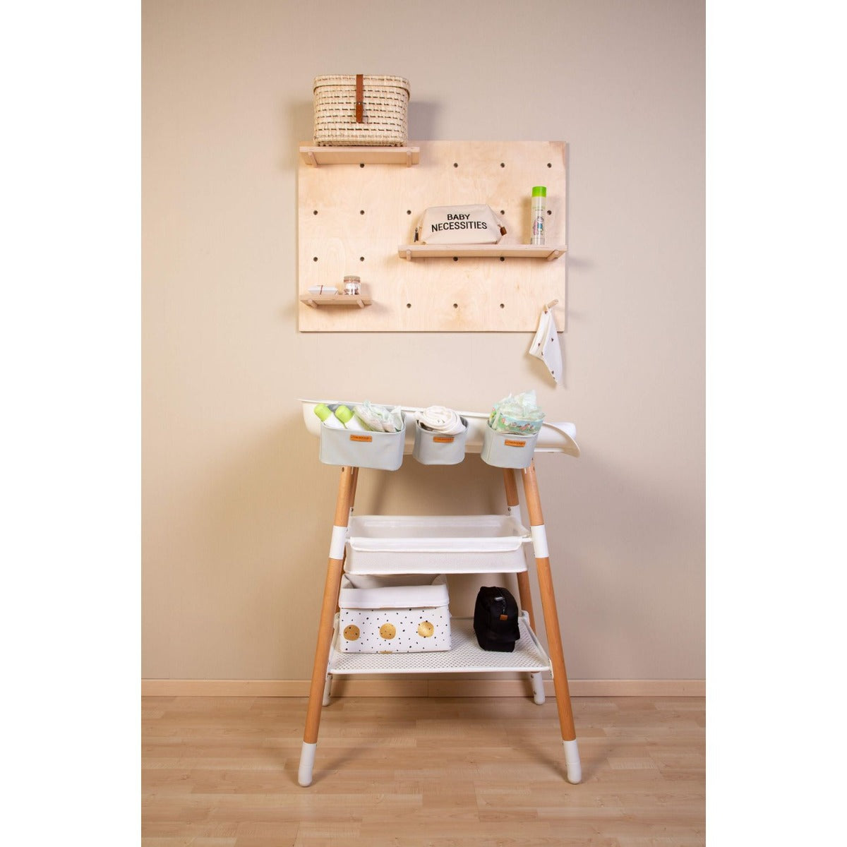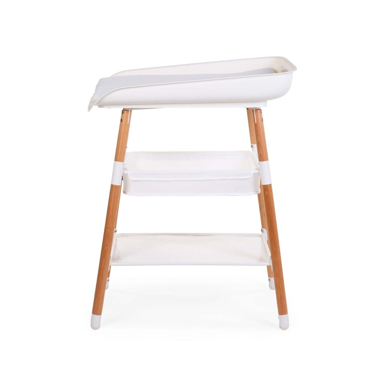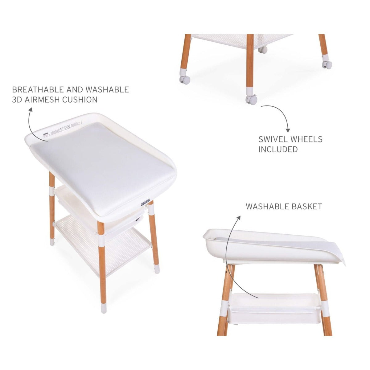 - Washable, removable storage basket underneath for storing changing essentials