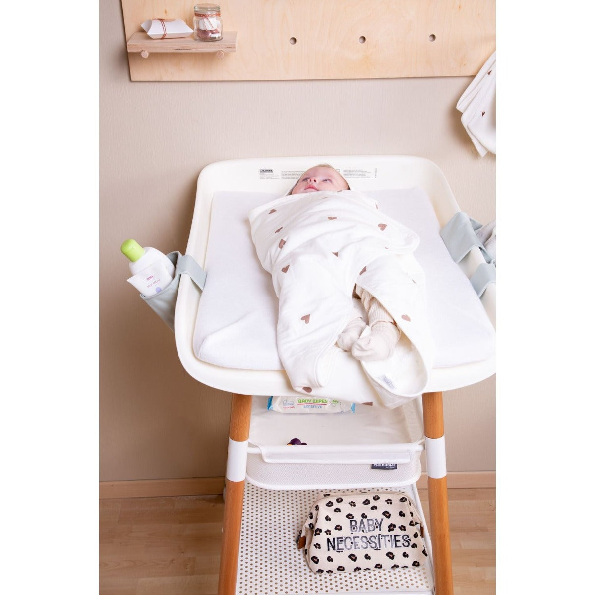 Childhome Evolux Changing Table is the first design changing table that can be adjustable to 4 different heights. Thanks to the wheels with brake system the table is easy to move from one room to another. A bigger changing unit, higher sides and a firm construction make it safe for a baby up to 15kg. A waterproof, washable and breathable 3D air mesh changing cushion is included. So the baby will be safe at all times.