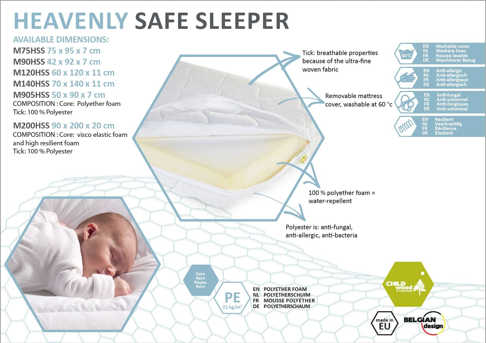 Childhome Heavenly Safe Sleeper Mattress is a polyether foam mattress with a fabric cover made of ultra-fine woven fabric that is highly breathable. This cover has a better air circulation than regular covers and thus better breathable properties. More than just a standard fabric, it is made with all the essential hygienic, anti-allergic and breathability properties a mattress to provide your baby with a clean, healthy and safe sleeping environment. The foam mattress uses high-quality materials to create a good, resilient and firm sleeping surface, which is essential for a comfortable and good night sleep.