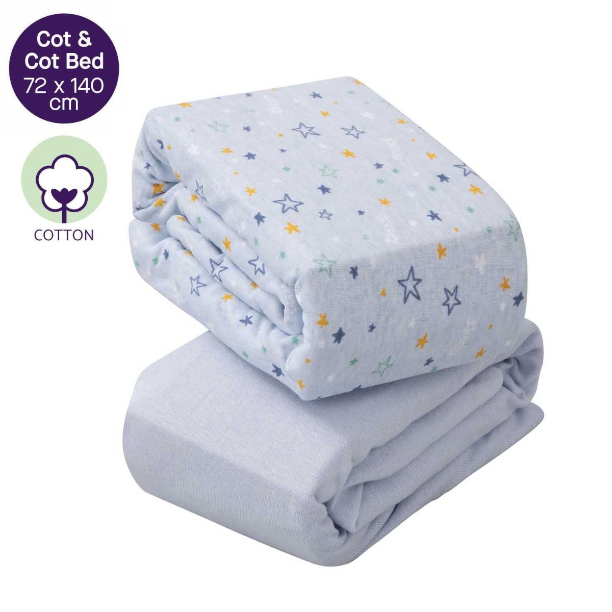 ClevaMama Jersey Cotton Fitted Sheets is a pack of 2 is designed to fit ClevaMama® mattresses, our cot and cot bed fitted sheets have an extra deep skirt to stretch and fit perfectly to any standard-size mattress for cots and cot beds. Made from beautifully soft jersey cotton, these elastic sheets come in a range of colours to suit any nursery and the twin pack means you always have one ready for a quick change. The fitted sheets for cot/cot bed measures 72 x 140 x 17 cm with 360° elastic for safe, secure fitting.