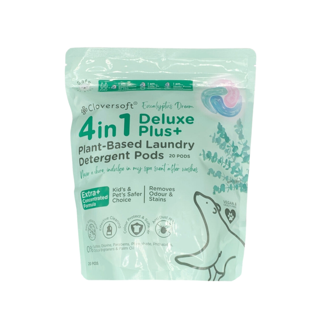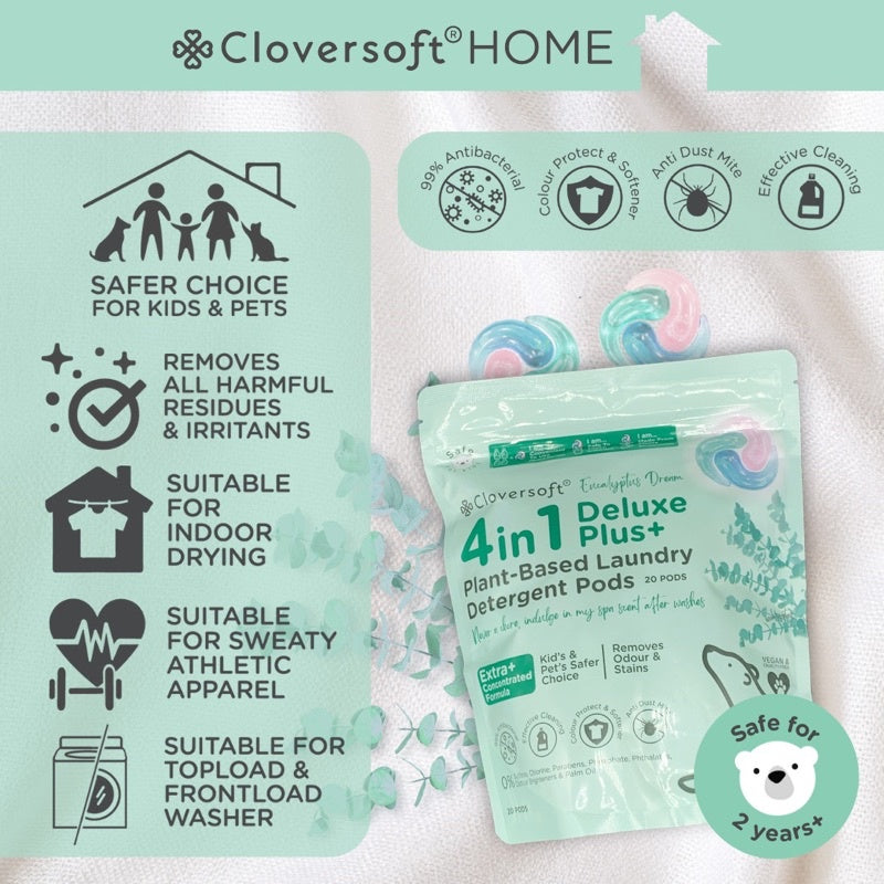 Cloversoft 4-in-1 Deluxe Plus+ Plant-Based Laundry Pods is a pack of plant-based 4-in-1 laundry pods (Eucalyptus Dream). Our brand new Eucalyptus Dream scent is made from natural Eucalyptus essential oil and helps to repel pesky bugs & insects! With Cloversoft, it’s never a chore as you indulge in our spa scent after washes! Plant-Based, Vegan & Cruelty-Free. Featuring EXTRA concentrated formulated! One pod is packed with Detergent + Colour Protect Softener + Antibacterial Agent + Anti Dust Mite Agent for effective cleaning and protection. No sulfates, chlorine, parabens, phosphate, phthalates & optical brighteners – worry-free & safe laundry pods. Suitable & Versatile for All Types of Households.