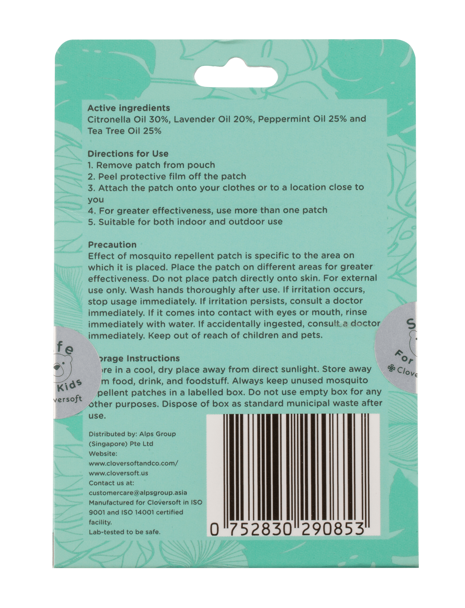 Cloversoft Mosquito and Garden Insects Repellent Patch is a patch to stick to your clothes to repel mosquitoes. A natural and effective way to keep you and your loved ones safe from persistent mosquitoes. Intricately formulated with safe and all-natural ingredients, the patch can provide up to 12 hours of protection from mosquitoes and garden insects (such as bees and flies).