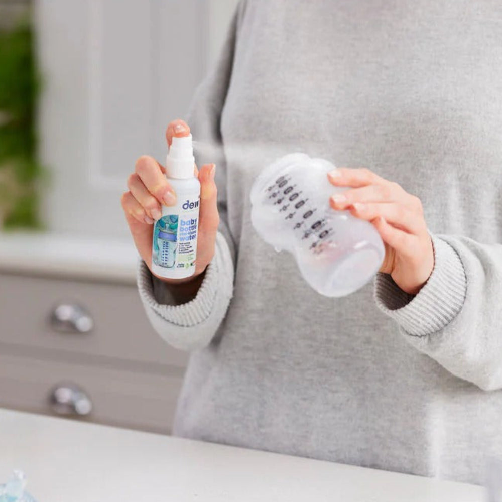 Dew Baby Bottle Sterilising Water is a convenient and safer way to clean and sanitise baby bottles, breast pumps and dummies. Not toxic and certified by Allergy UK. It has a powerful, no-rinse formula proven to be over 99.99% effective against viruses, bacteria, fungi and yeasts. Our sterilising water has been developed with your baby’s safety in mind. Its active ingredient (HOCl) is found naturally in our bodies, helping to keep us safer from infection. Our formula is hypoallergenic, non-irritant, ph skin compatible, vegan and Halal friendly. For on-the-go cleaning, simply spray every surface of the item and leave for 3 minutes before using. When at home, you can dilute the sterilising water to soak the items for 30 minutes with no need to rinse after soaking. . Experience the simplicity and effectiveness of Dew Disinfect Baby Bottle Sterilising Water – where hygiene meets ease of use, ensuring your baby’s essentials are kept in the cleanest, safest condition, whether you’re at home or out on your next family adventure.