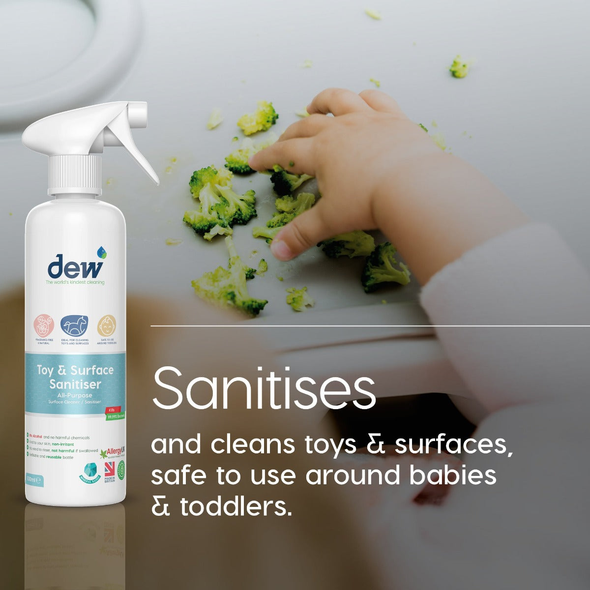 Dew Toy & Surface Cleaner contains no harmful chemicals, so it will not endanger the health of your child, quite the opposite in fact, because its antimicrobial properties are 99.99% effective, providing that extra level of protection. Additionally, it is certified by Allergy UK.