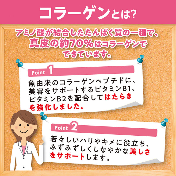 Nutritional facts (per 6 tablets): Calories 7.8kcal, protein 1.88g, fat 0.02g, carbohydrate 0.02g, sodium chloride equivalent 0.003g, vitamin B1 14.0mg, vitamin B2 2.0mg, collagen peptide (fish-derived) 2,050mg