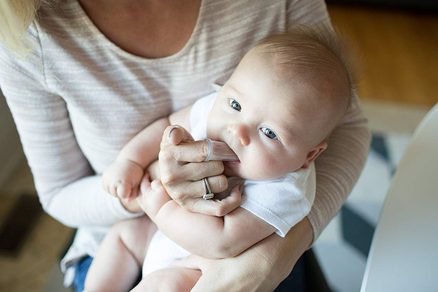 - Fits over adult finger – easy to brush baby’s teeth and gums