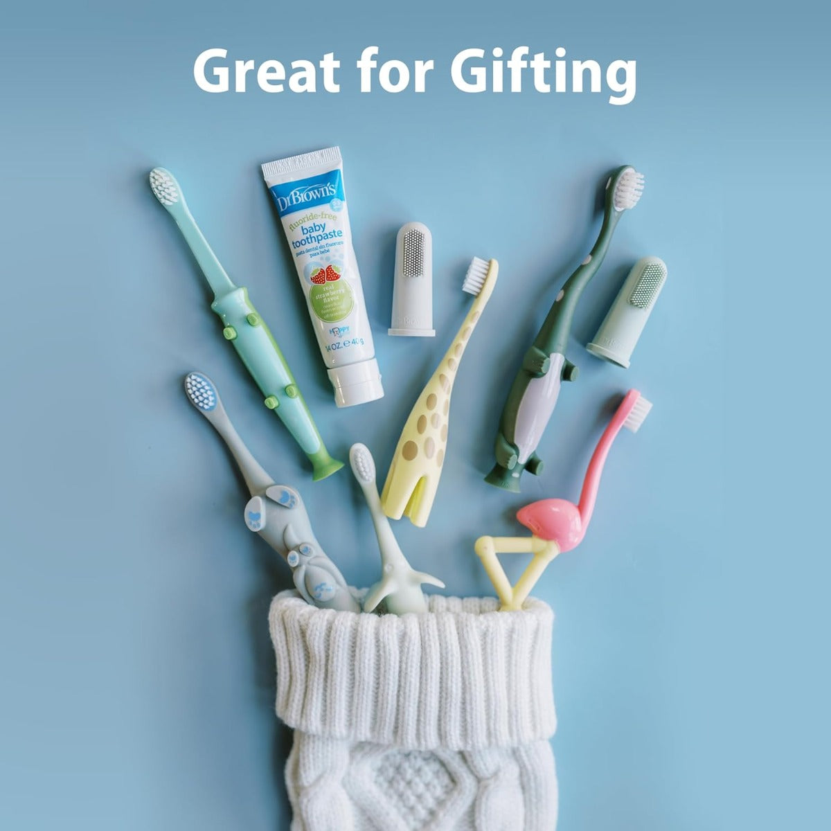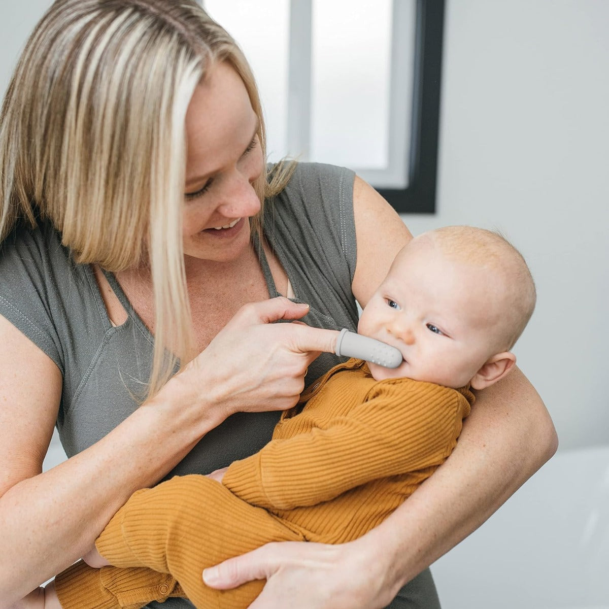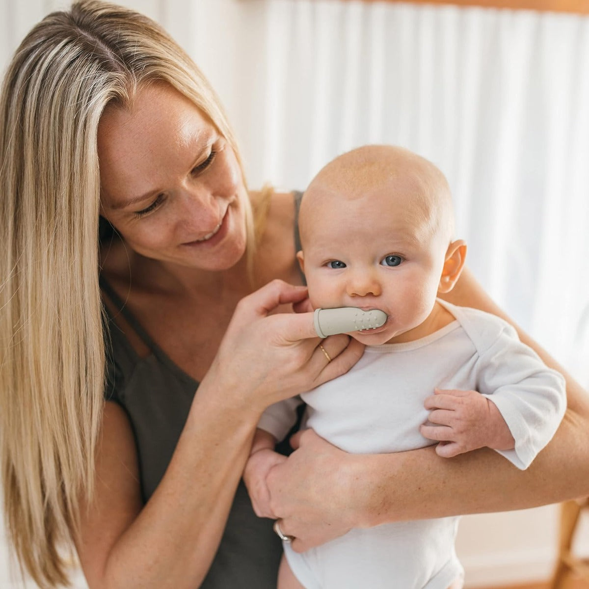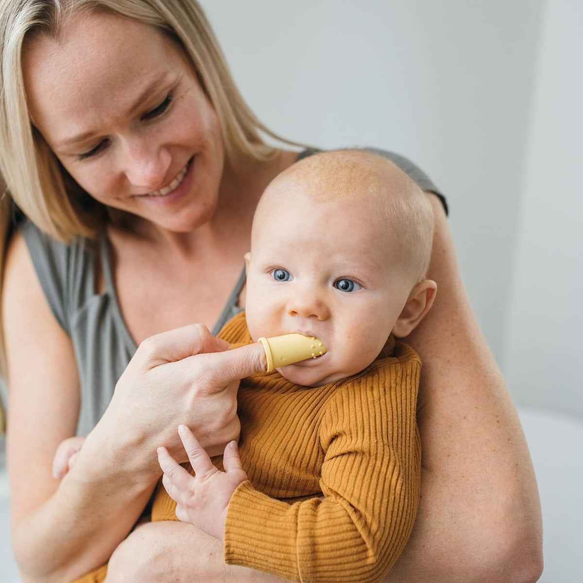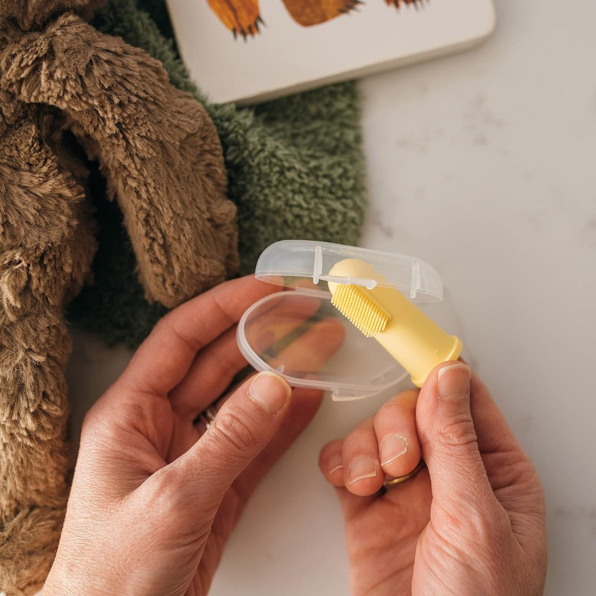 Dr Brown's Silicone Finger Toothbrush with Case packs two soft, silicone bristles finger brushes for babies. Silicone bristles gently clean baby’s gums and emerging teeth. This dual-sided toothbrush features a textured surface that massages the inside of baby’s cheeks and gums to relieve teething soreness. The Silicone Finger Toothbrush fits comfortably over an adult finger and is easy to slip on. The included storage case is great for travel and protects the toothbrush when not in use. The Finger Toothbrush can be used with or without toothpaste. Safe for use in dishwasher (top rack only), electric and microwave sterilizers or boiling water.