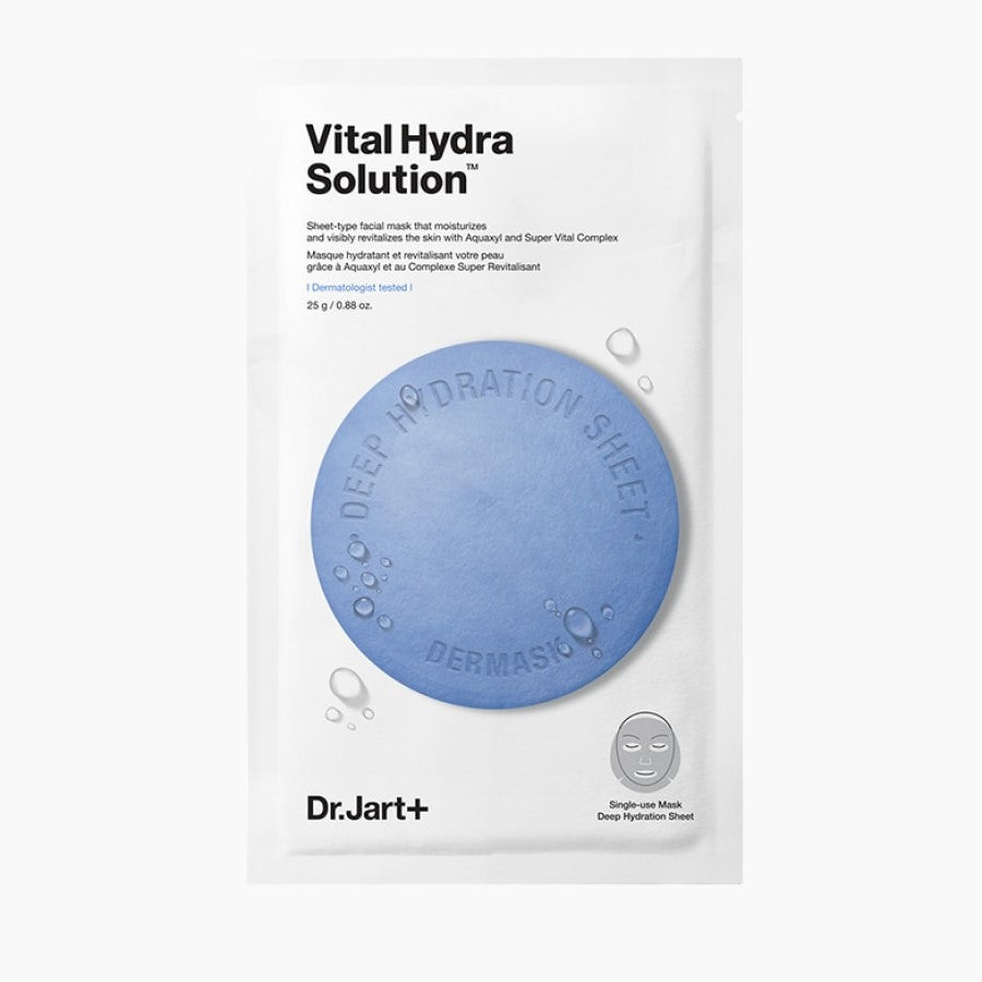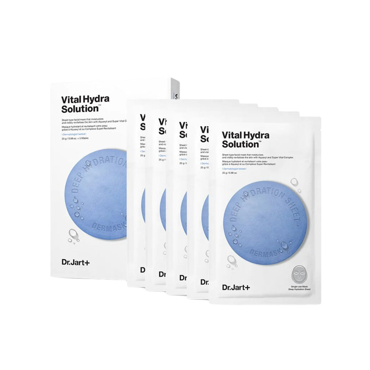 Dr. Jart+ Water Jet Β Vital Hydra Solution Facial Mask is a pack of 5 hydrating sheet masks that quenches the skin on contact and then plumps it up with replenishing moisture. Β This thin sheet mask blasts moisture into the skin like a water jet. Infused with a rich essence containing Aquaxyl and Xylitol, which work together to enhance moisture retention and strengthen the skin's barrier. Oligo-hyaluronic acid and algae extract provide long-lasting moisturization and support natural collagen synthesis, leaving your skin feeling soft, smooth, and radiant.Β After one use skin is softer, smoother, glowier and healthier looking. And itβs plumped up with moisture. Dermatologist tested.Β Β