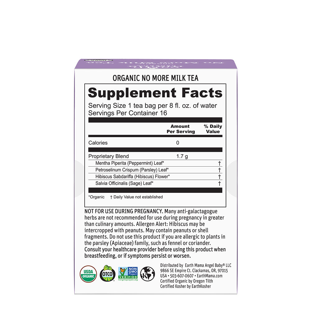 Earth Mama Organic No More Milk Tea is a pack of 16 comforting tea that is formulated with anti-galactagogue herbs including sage, peppermint and parsley, traditionally used to help reduce the production of breast milk when it is no longer desired. Bonus: a tangy note in the form of Hibiscus flower. Sometimes, a soothing cup of tea is an act of kindness. Whether from weaning or baby loss, excess or unwanted breast milk can intensify discomfort during an emotional time and cause sore, aching, engorged breasts.