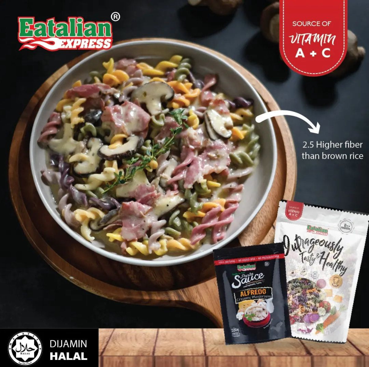 Eatalian Express Fusilli Pasta is made from a combination of 10 different types of fresh vegetables, durum wheat semolina flour and water. The vegetables used are - spinach, carrot, pumpkin, broccoli, beetroot, sweet potato, tomato, red spinach, purple carrot and cauliflower.