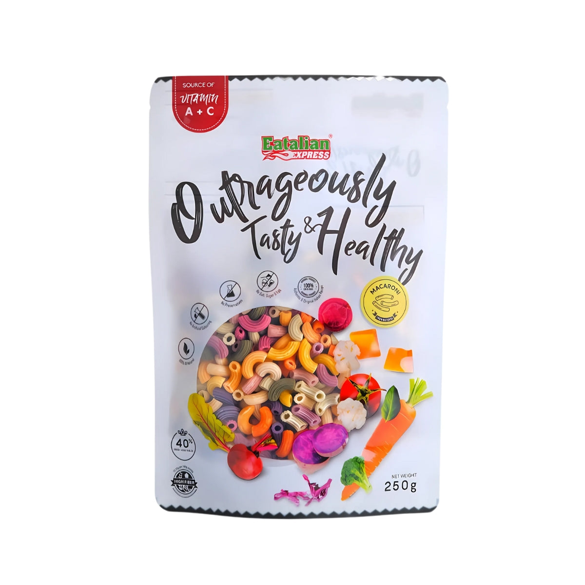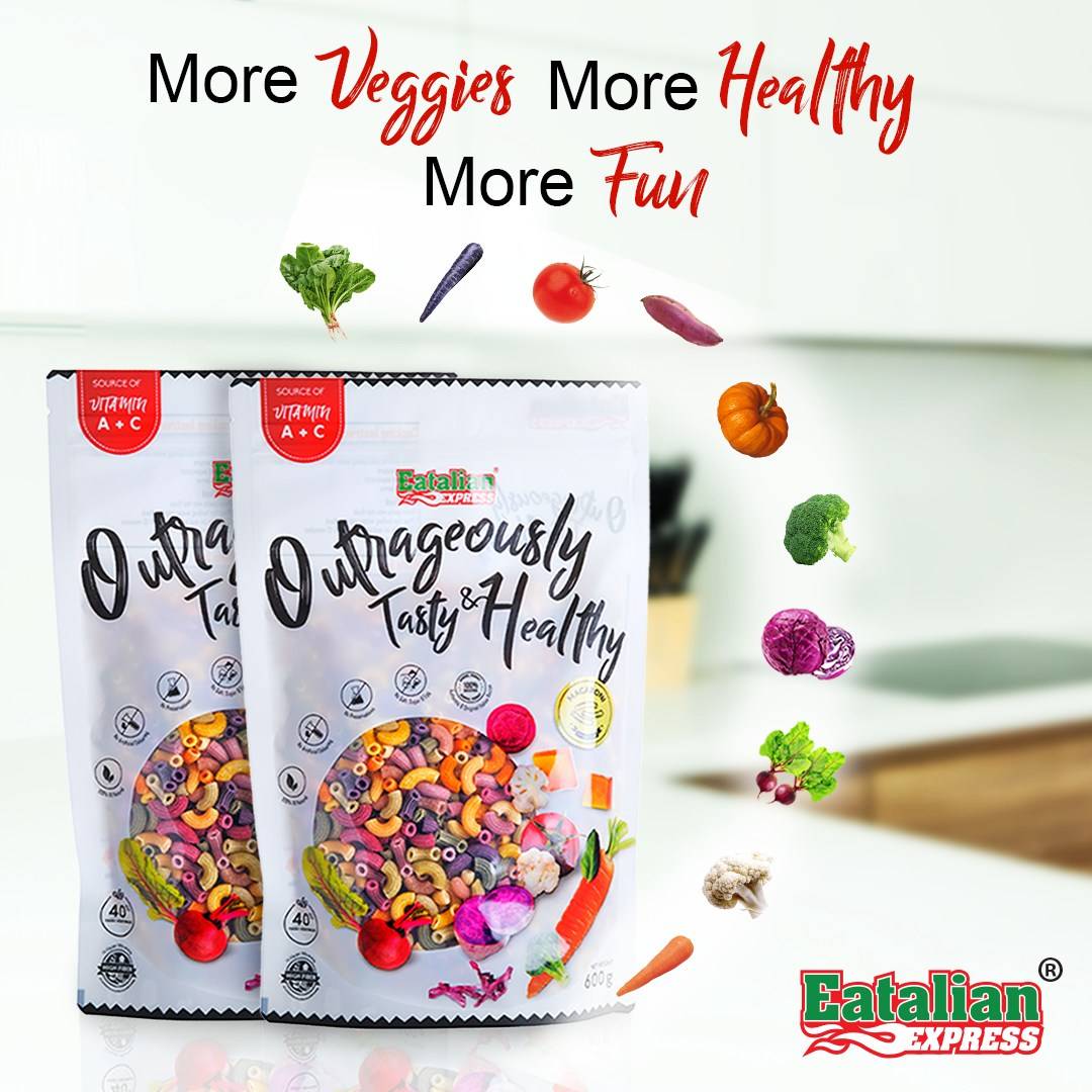 Eatalian Express Macaroni Pasta is made from a combination of 10 different types of fresh vegetables, durum wheat semolina flour and water. The vegetables used are - spinach, carrot, pumpkin, broccoli, beetroot, sweet potato, tomato, red spinach, purple carrot and cauliflower.