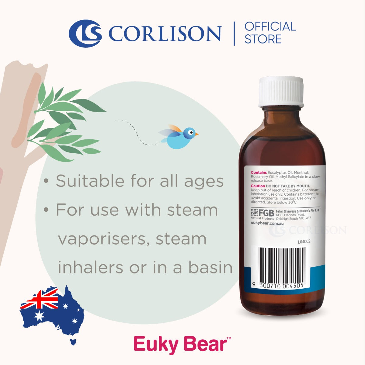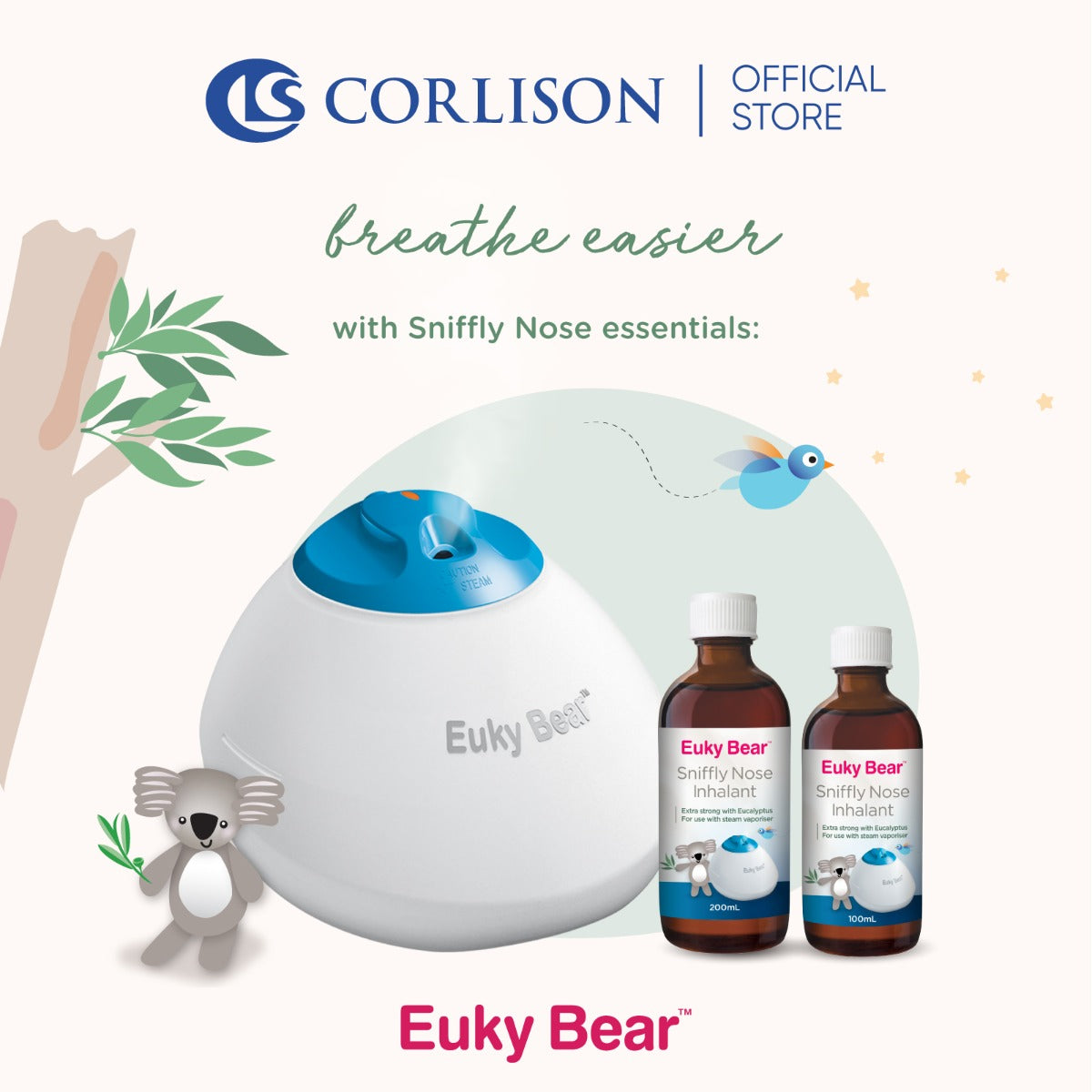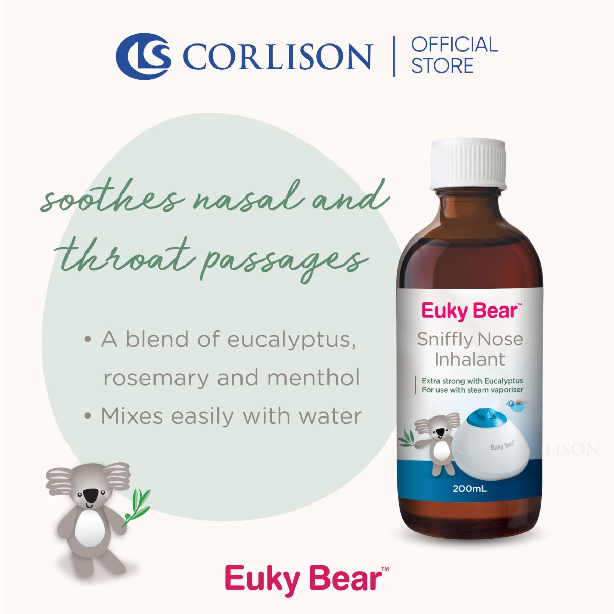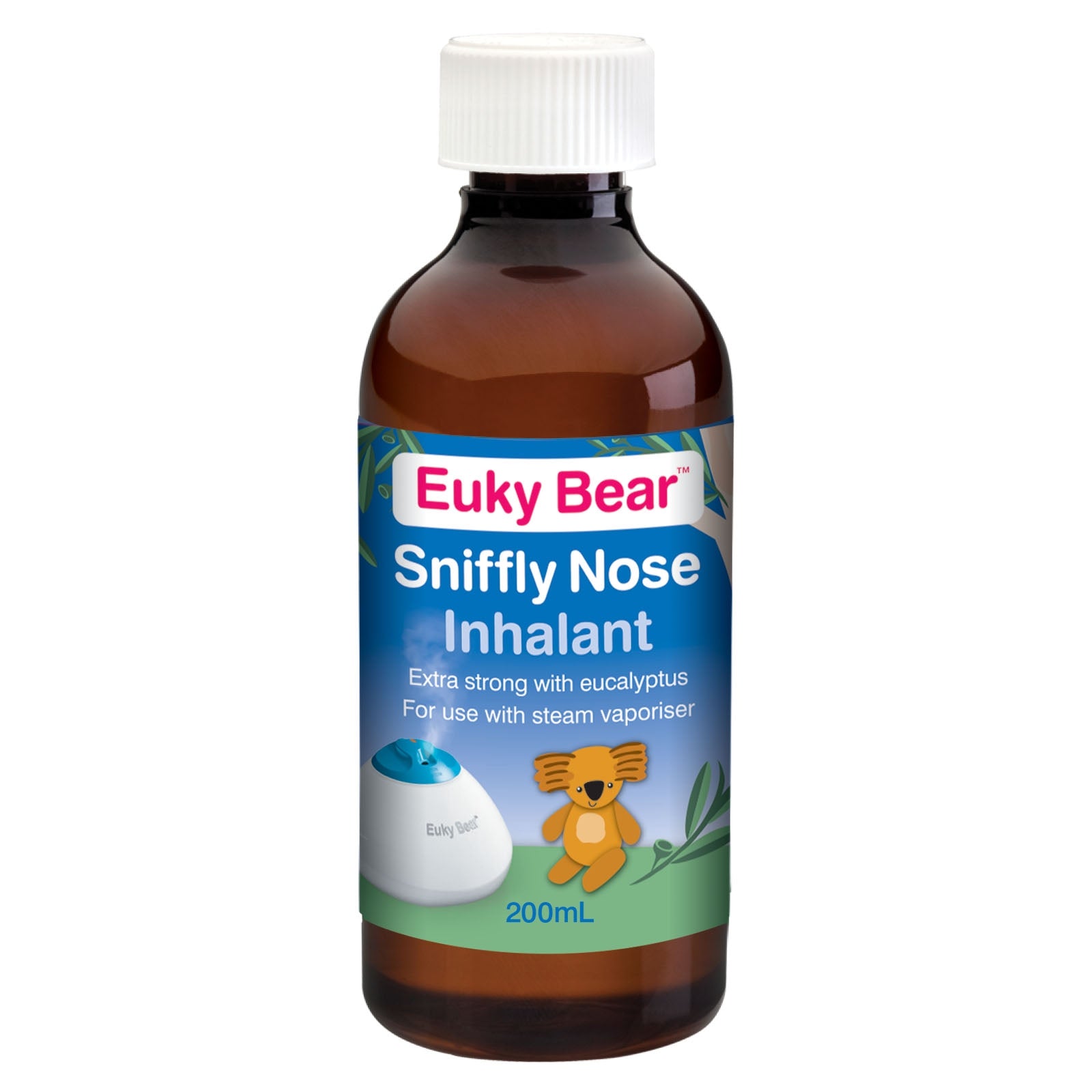 Euky Bear Sniffly Nose Inhalant is a strong blend of eucalyptus, rosemary and menthol for steam inhalation. The vapours soothe nasal and throat passages providing comfort to children of all ages. Euky Bear Sniffly Nose Inhalant is specially formulated to be used with a steam vaporiser. It mixes easily with water, enhancing the benefits of steam vapour and providing all-night comfort.