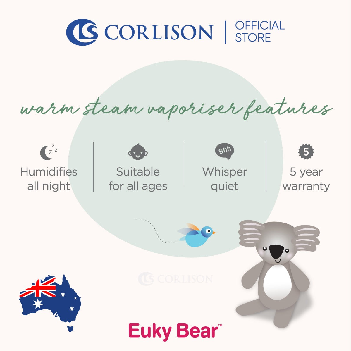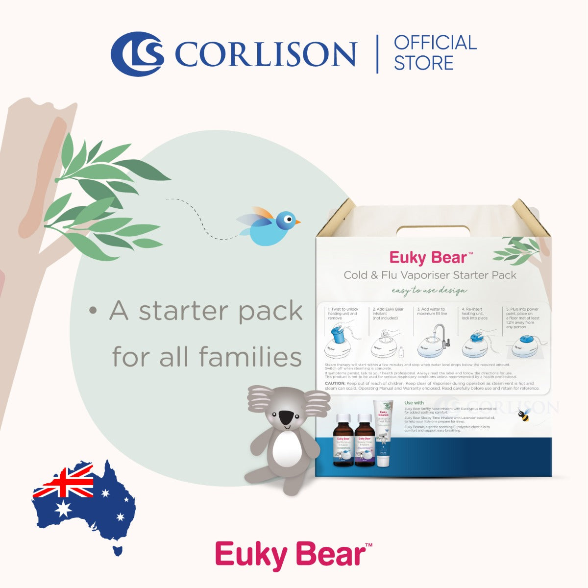 TIP: To get the most out of your steam vaporiser, we recommend Euky Bear or Bosisto’s Inhalants only. These inhalants are water soluble and specially formulated for your vaporiser.