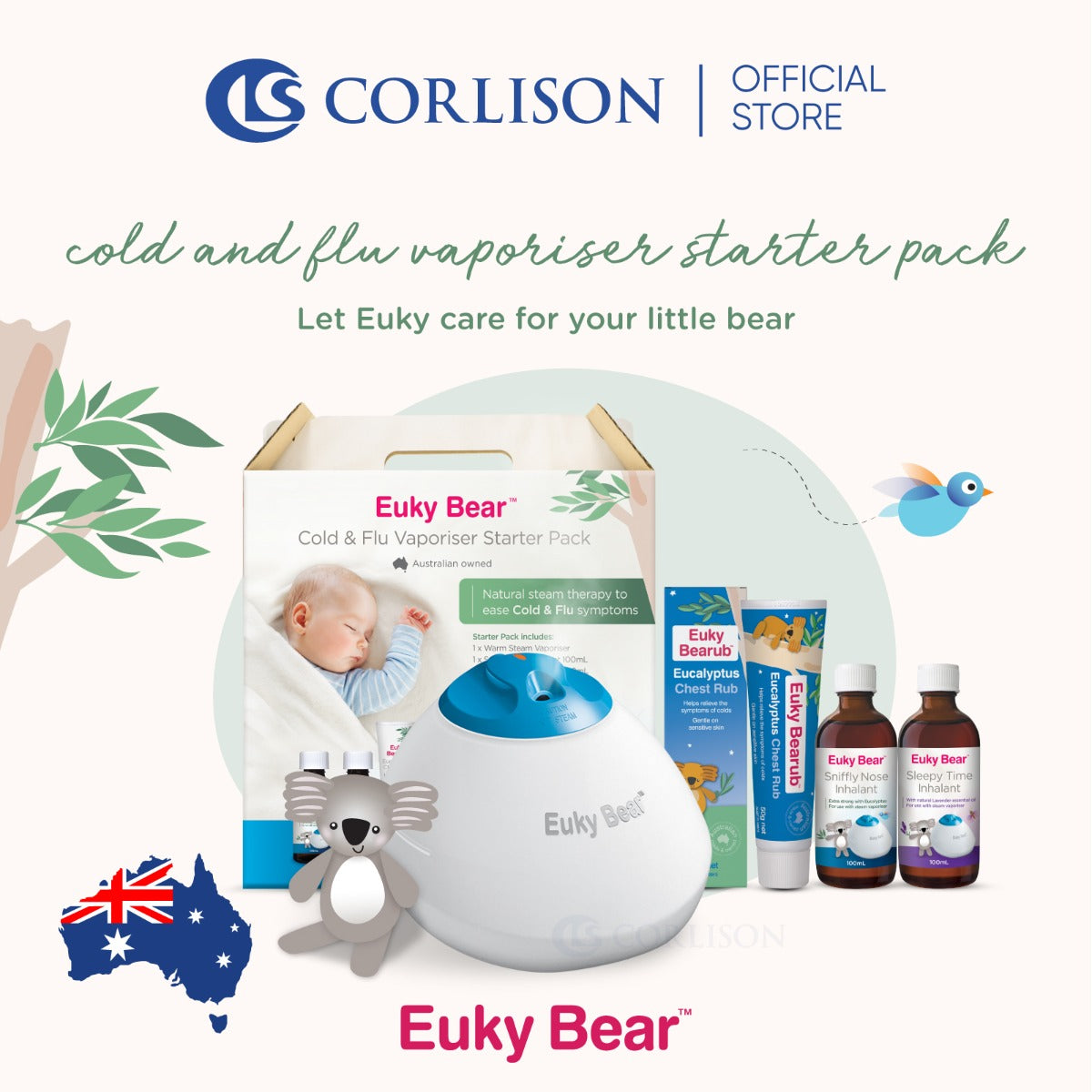 Euky Bear Steam Vaporiser creates a soothing flow of steam to help loosen phlegm and congestion in the chest and nose for easier breathing. Adding moisture to the air also helps soothe a sore throat and dry itchy eyes for a more comfortable sleep. It is also whisper quiet for better rest. After almost 40 years comforting Aussie families, Euky Bear knows a thing or two about sniffles, coughs and colds. Let Euky care for your little bear – from newborn babies to toddlers, kids and onwards – with this natural range of cold & flu solutions. Euky Bear Steam Vaporiser Starter Pack is a must-have in all homes, especially during the cough and cold seasons.