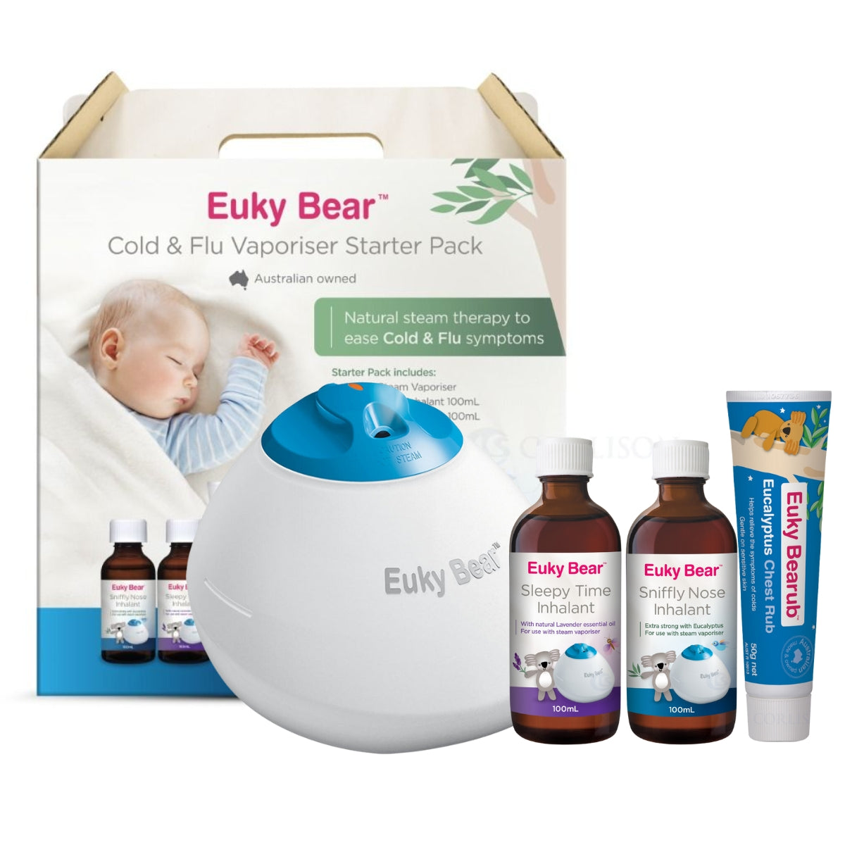 The Starter Pack contains a Steam Vaporiser, Bearub 50g, Sniffly Nose Inhalant 100ml, Sleepy Time Inhalant 100ml.