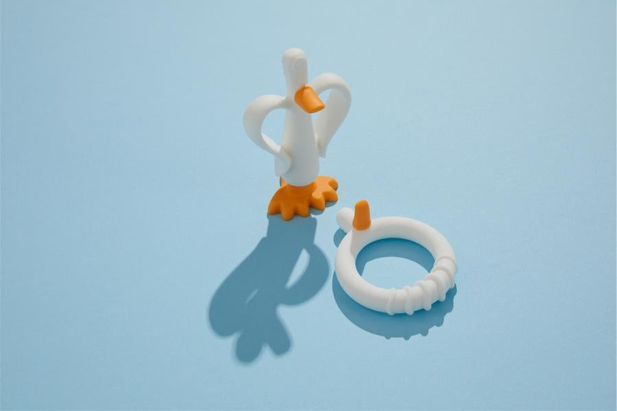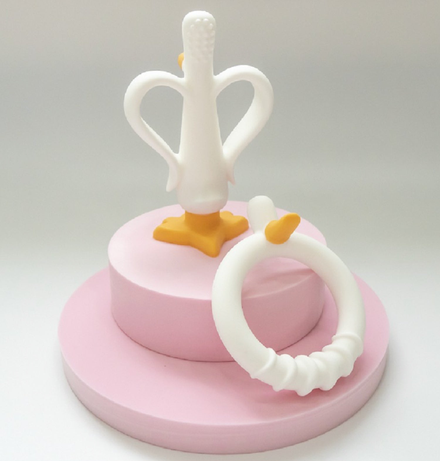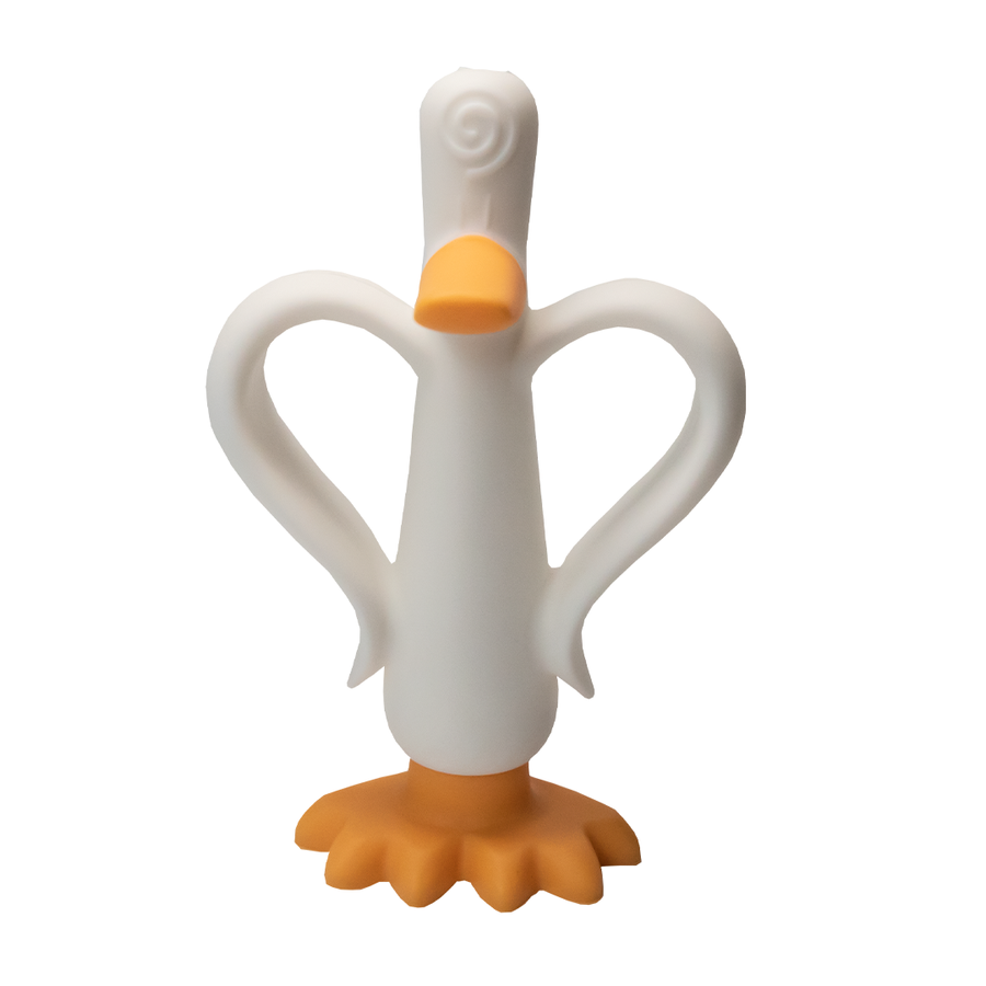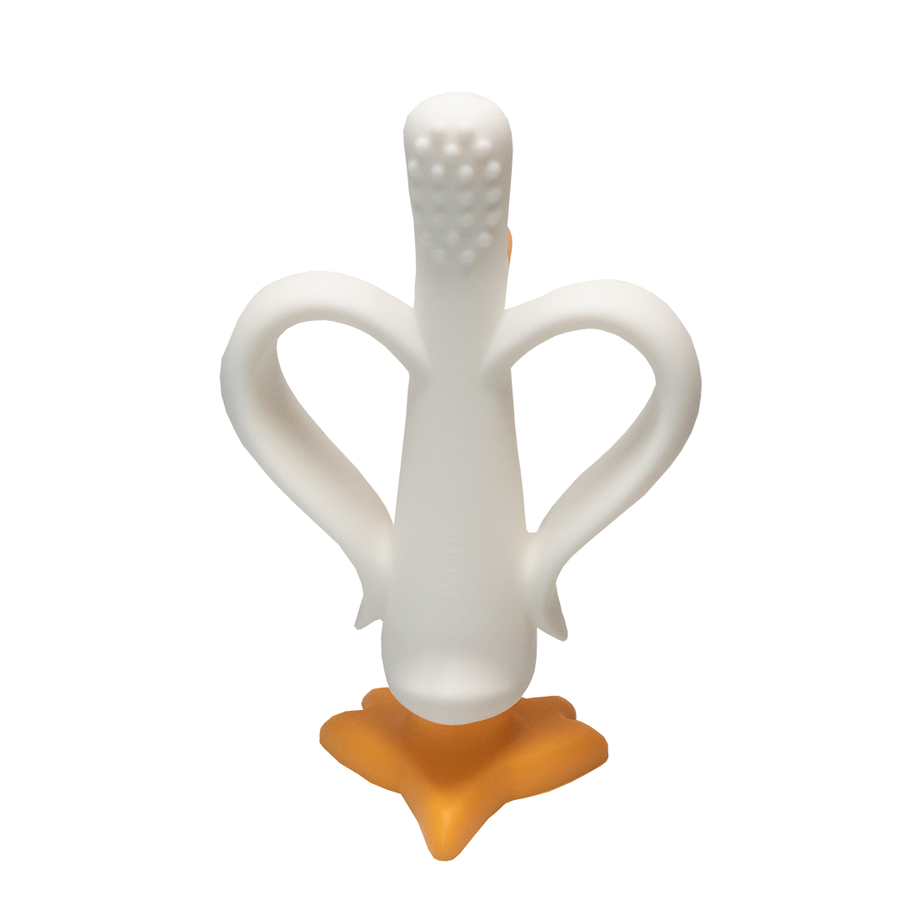 Evorie Dippy Duck Silicone Soothing Teether is a soft silicone teether perfect for soothing tender gums and providing teething relief. When babies use a teether, they learn about textures, tastes, and temperatures. It also helps in their hand-mouth coordination. This provide babies with a good foundation to move on from purees to solid foods. The teether also helps move their tongue and jaw in new and interesting ways, building muscles related to teething also supports sound production & speech development.