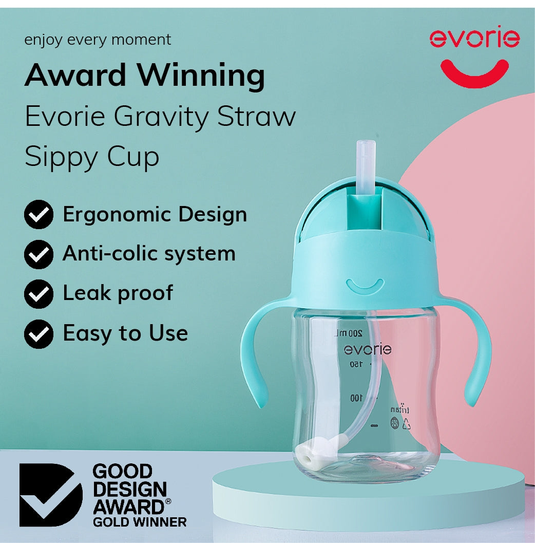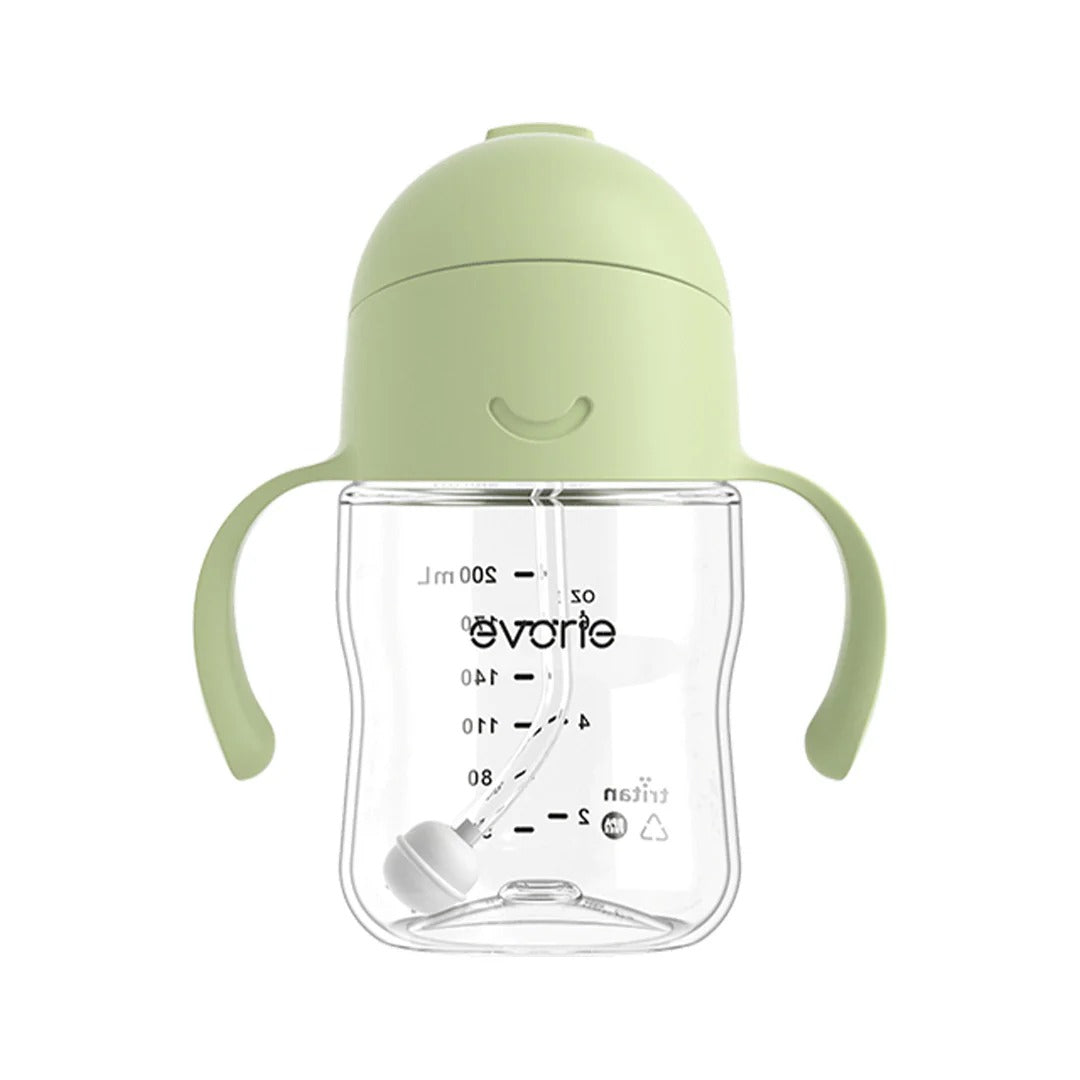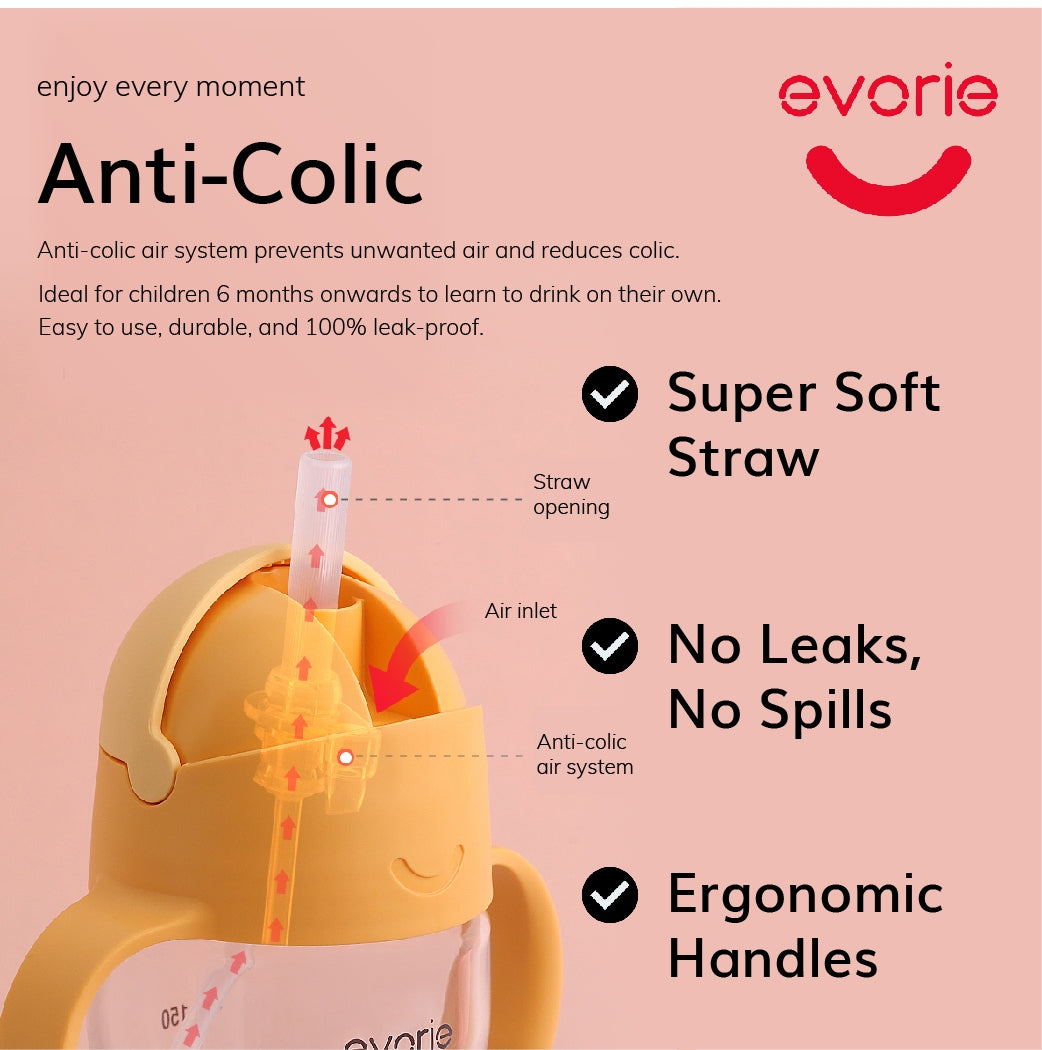 Evorie Tritan Gravity Straw Sippy Cup Water Bottle is a leak-proof, durable and multi-angle drinking straw bottle made of Tritan. Comes with ergonomic handles and soft straw. Ideal for children 6 months onwards to learn to drink on their own. Easy to use, durable, and 100% leak-proof. Featuring a weighted straw, which allows for multi-angle drinking. Perfect for toddlers!