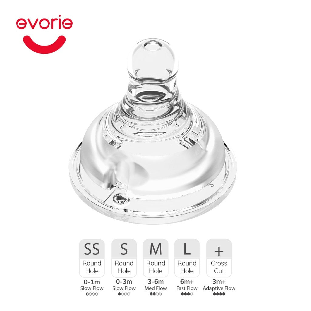 Evorie Wide-Neck Baby Feeding Bottle Teat is a super soft teat designed to ensure smooth transition from breast to bottle to cup, letting the right volume of milk flow through based on your child's development stage. Anti-colic air system minimises air intake for a more comfortable feed. As your baby grows, the teat that is best for them changes too. Grow with the right flow!