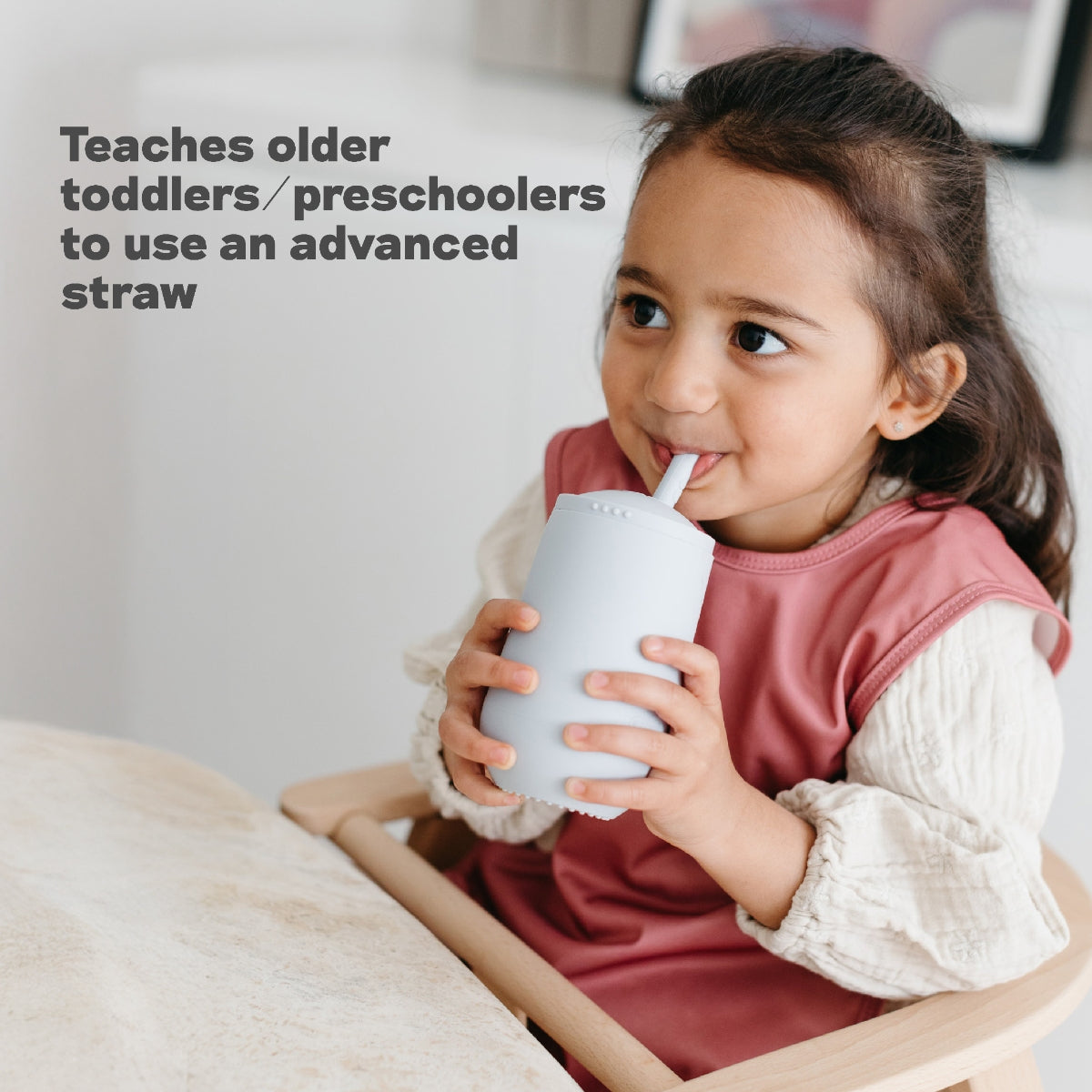 EzPz Happy Cup + Straw System teaches older toddlers and preschoolers to safely drink from an open cup and straw independently. Learning to drink from a straw is an important developmental milestone that develops lip rounding and promotes speech development.