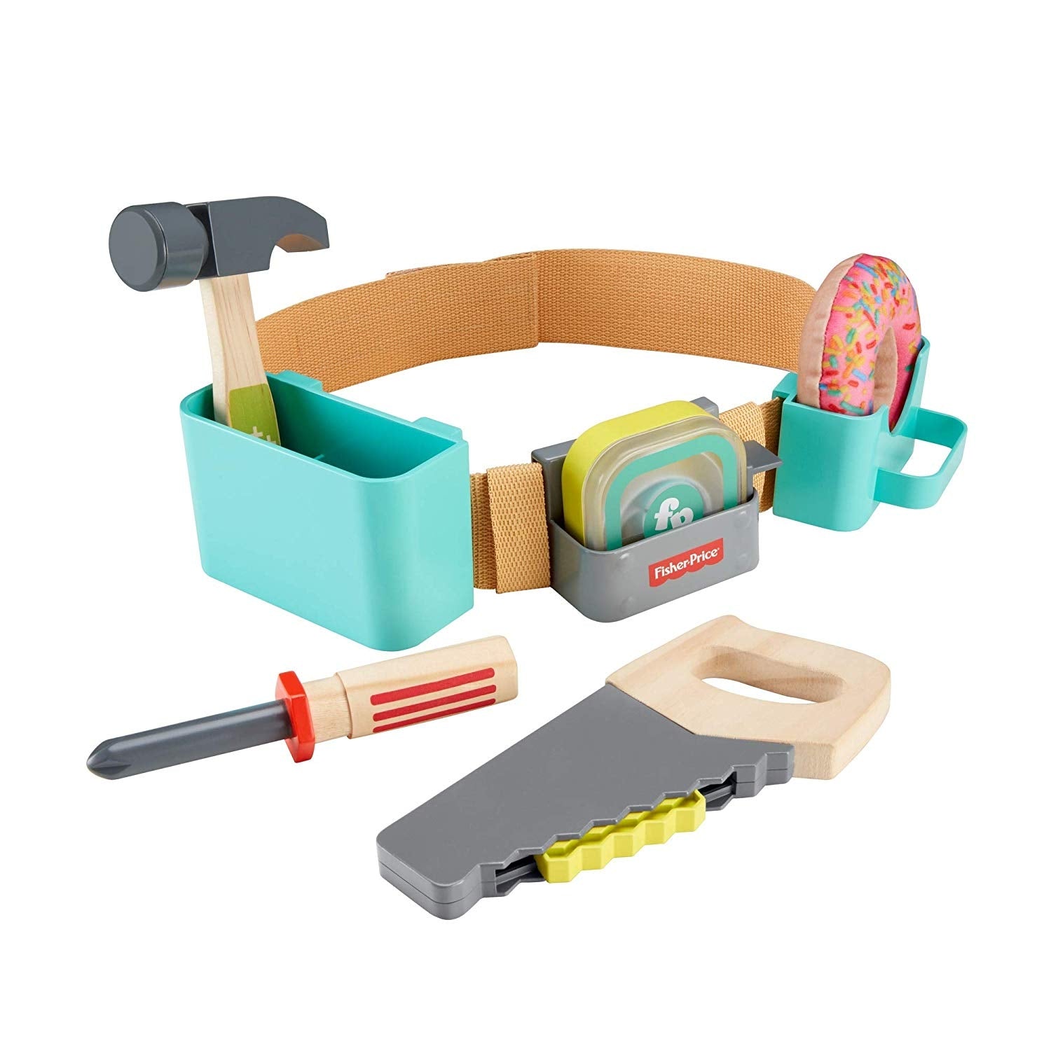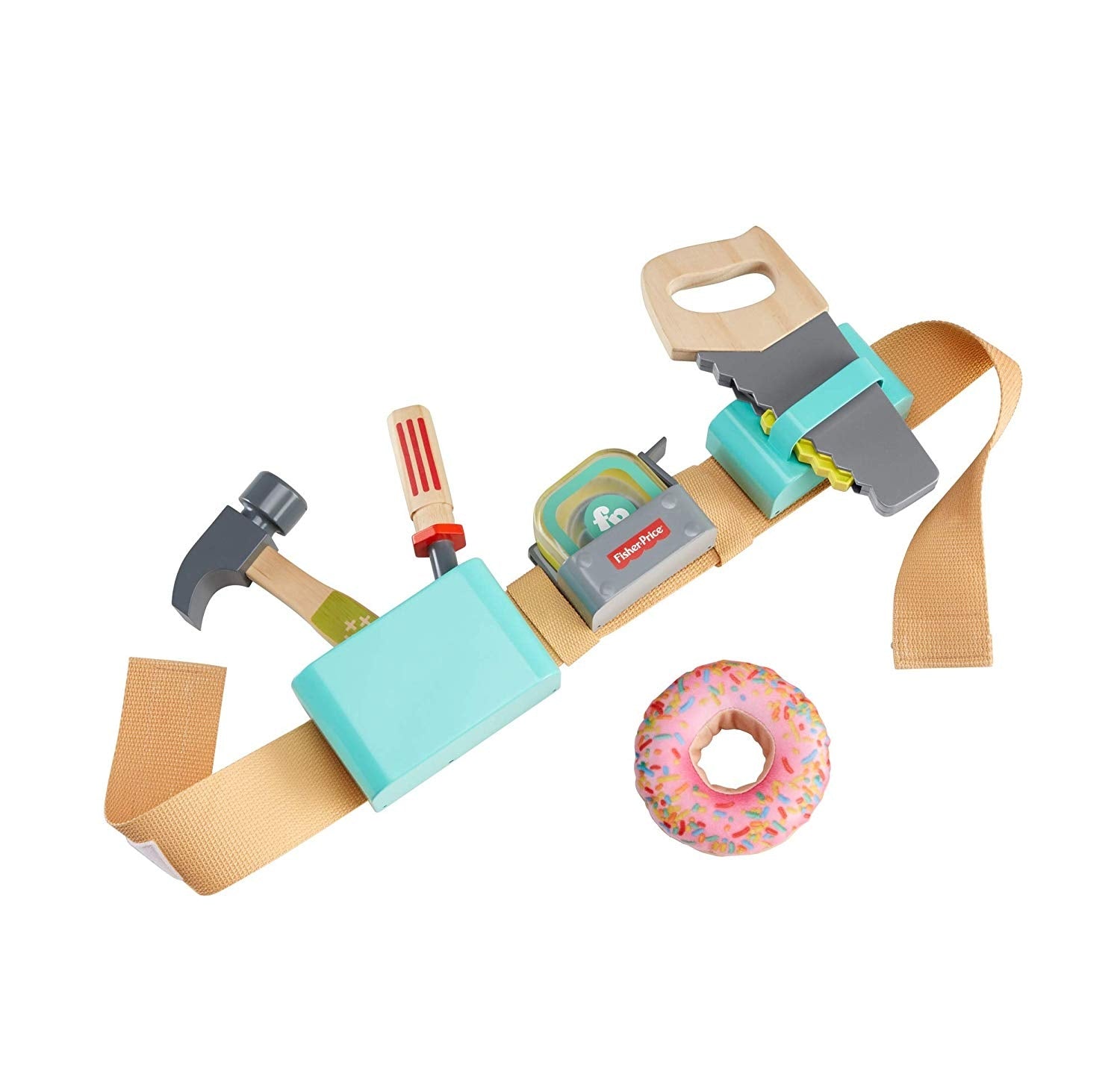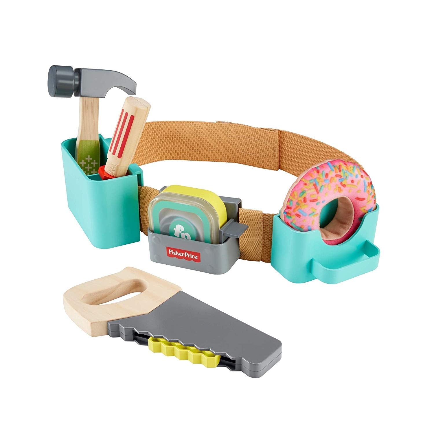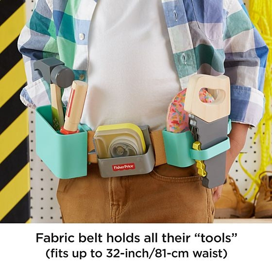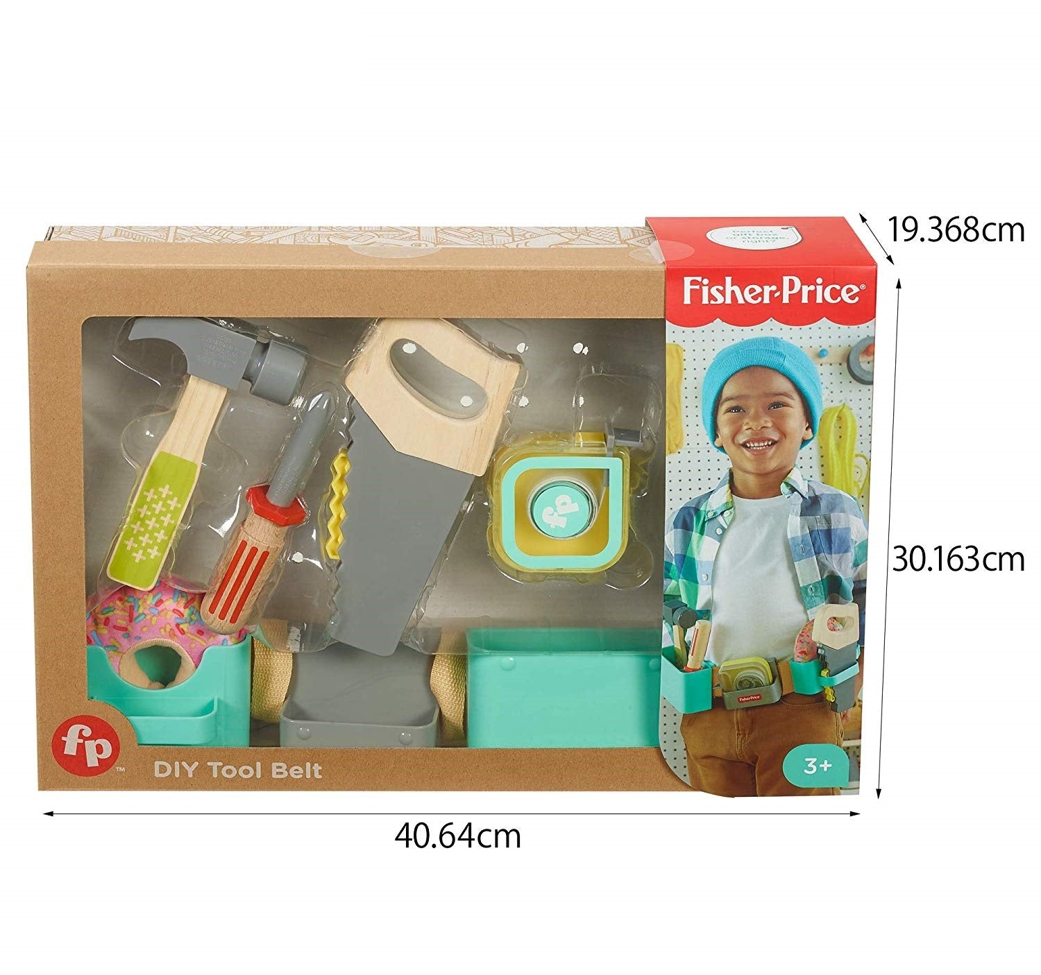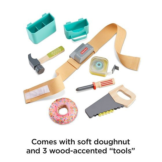 Fisher Price DIY Tool Belt is a pretend DIY toy kit consisting of a fabric tool belt has convenient storage slots for all their tools, including a pretend hammer, screwdriver, a cool saw that makes sounds as it 'cuts,” and a real working, retractable fabric measuring tape. It even comes with a fabric doughnut to reward your preschooler for a job well done. Whether you're tinkering in the garage or working on a home improvement project, your favorite assistant will be right by your side with cool tools of their own! Your little builder will have a blast 'fixing” things around the house with the Fisher-Price® DIY Tool Belt role play set.