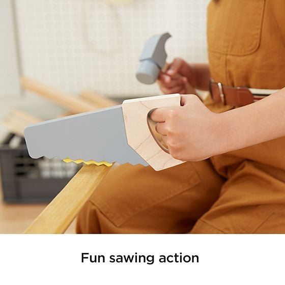 - Pretend hammer, screwdriver, and saw with real wooden handles, and soft doughnut